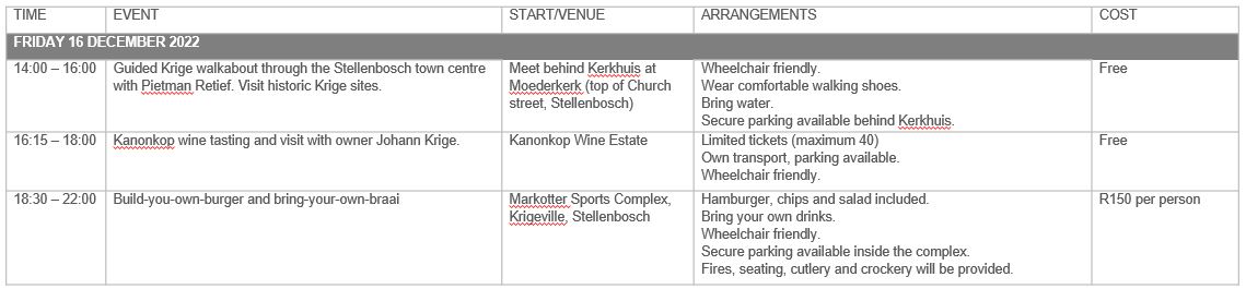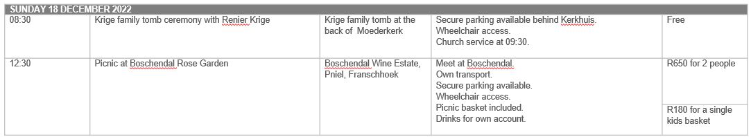 Join the extended Krige family for the first festival in 50 years to celebrate 300 years in South Africa! All extended Krige family members are welcome to join us from 16 - 18 December 2022 in Stellenbosch to make old and new connections.