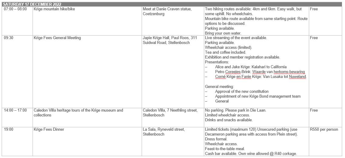 The Krige Annale family history book will be available for sale at the Krige General Meeting.