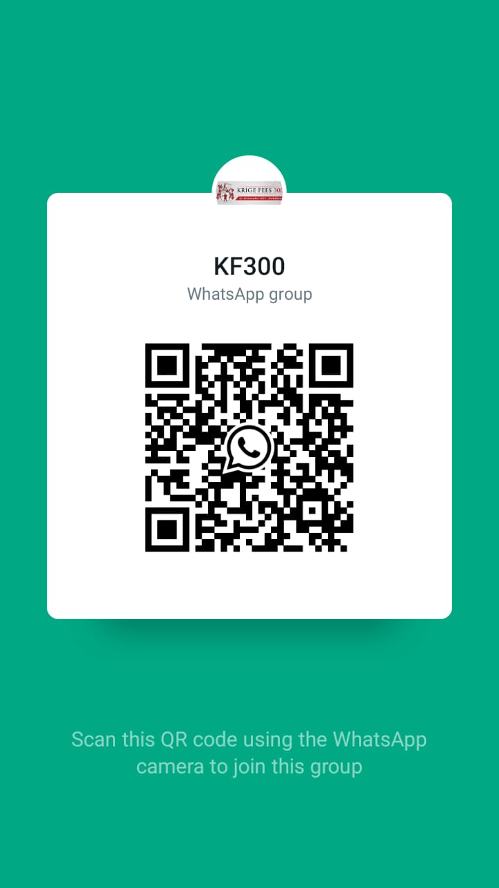 Please scan the QR code below with your phone camera to join the Krige Fees 300 Whatsapp group. This group will communicate important event and logistics information. Use #krigefees300 for social media.