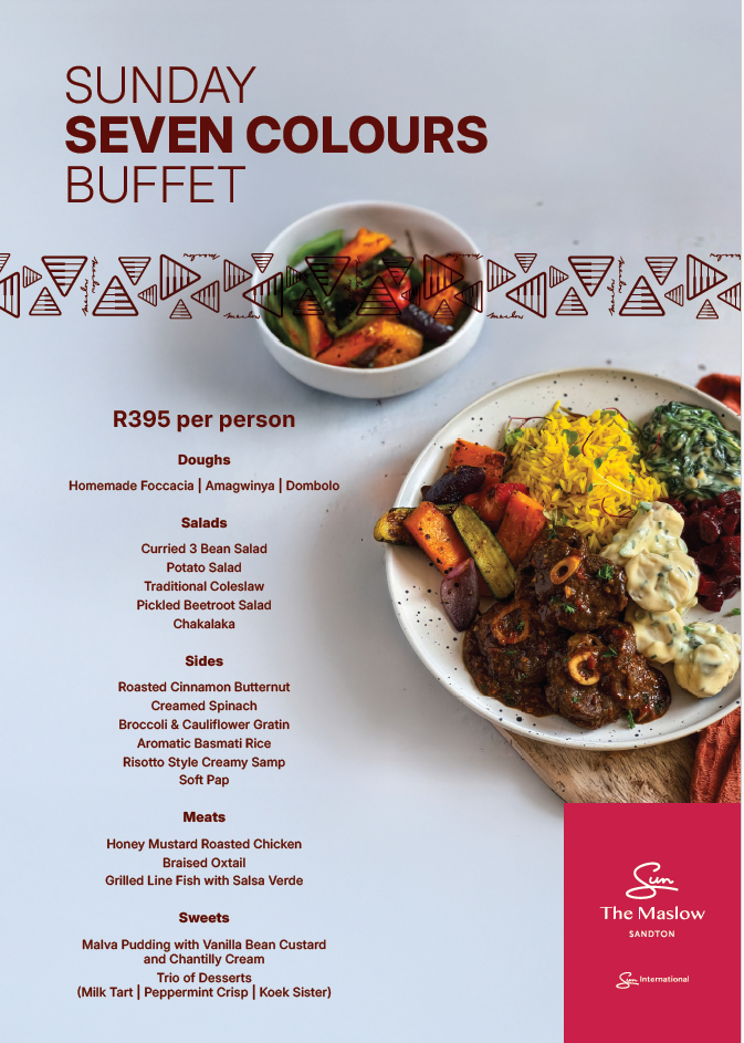 Indulge in a bottomless Seven Colours Sunday Lunch at The Maslow Sandton, where rich, vibrant flavours come together for a hearty and nostalgic feast. Gather your loved ones and make it a lovely weekend to savour on Sunday.