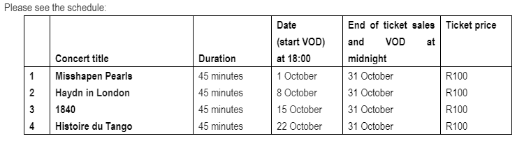 The first of four concerts will premiere on Thursday 1 October 2020 and each week a new concert will be released.