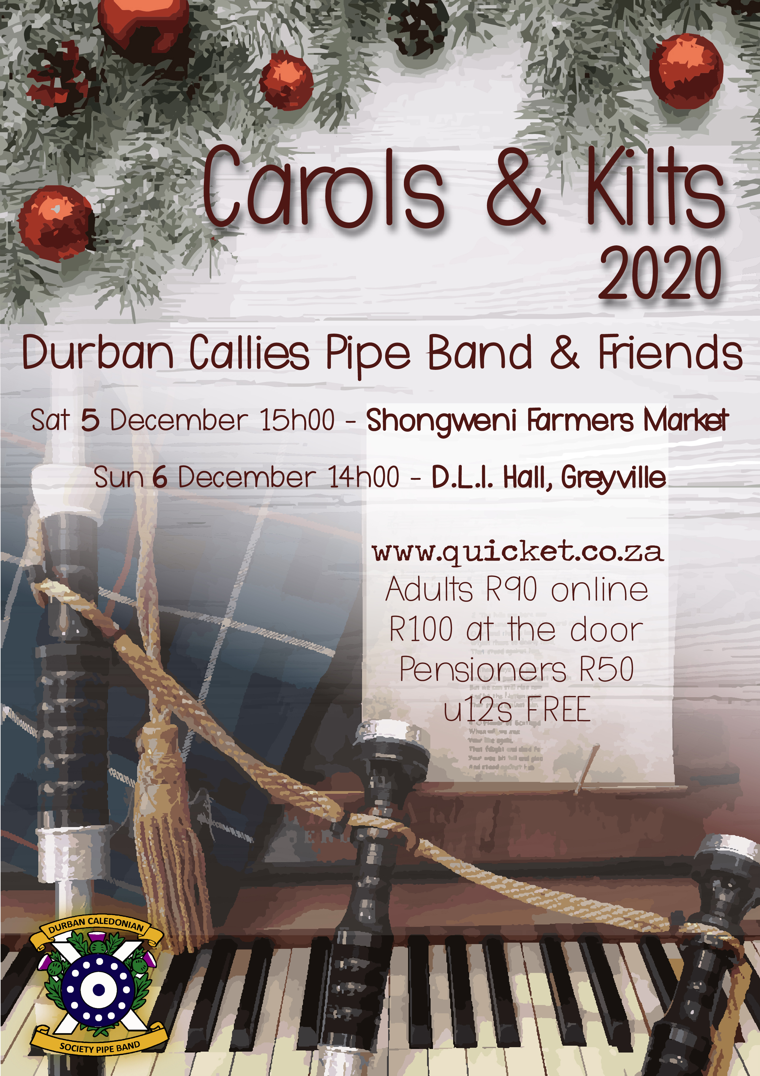 Presenting the eighth annual production of Carols & Kilts with Durban Caledonian Society Pipe Band and Friends - an opportunity to kick off the festive season with a blend of highland music and Christmas carols.