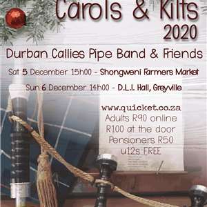 - Saturday 05 December 2020 - 15:00 to 17:00 - Shongweni Farmer's Market (tickets available at https://www.quicket.co.za/events/121412-carols-kilts-2020-at-shongweni-farmers-market/)