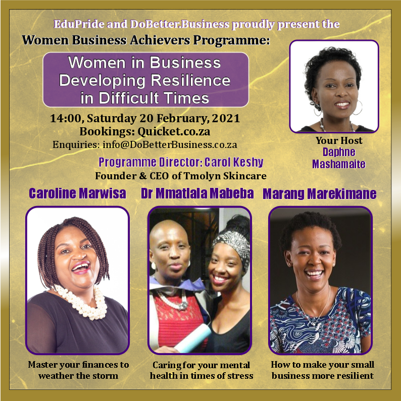 Proudly presented by EduPride and DoBetter.Business: "Developing Resilience in Difficult Times" webinar is for dynamic businesswomen who are determined to make 2021 the year that their businesses thrive