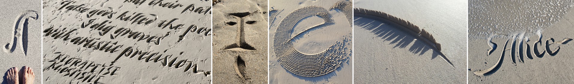 Andrew van der Merwe is a professional calligrapher and letter artist from Cape Town. His work ranges from traditional illuminated addresses to commercial lettering, and from calligraphic art and murals to period movie props – anything that involves skilled writing. But he is more widely known for a new art form that he calls beach calligraphy and has presented workshops here in South Africa, in the United States and Belgium. His work has been published in calligraphy journals such as Letter Arts Review, Alphabet and Colophon and reported on in the Sunday Times, Business Day, Huffington Post, and CNN, among others. Have a look at his work under the name @beachscriber on Facebook and Instagram where he has a strong international following.