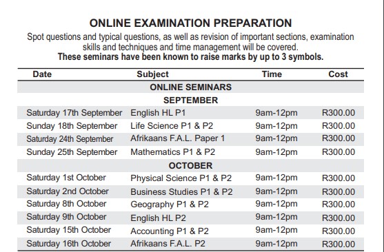 ONLINE COST: R300 per online seminar Seminars are presented online by outstanding , experienced teachers who have been hand-picked for their ability to provide clarity and insight. Revision notes, where necessary, are included in the price.