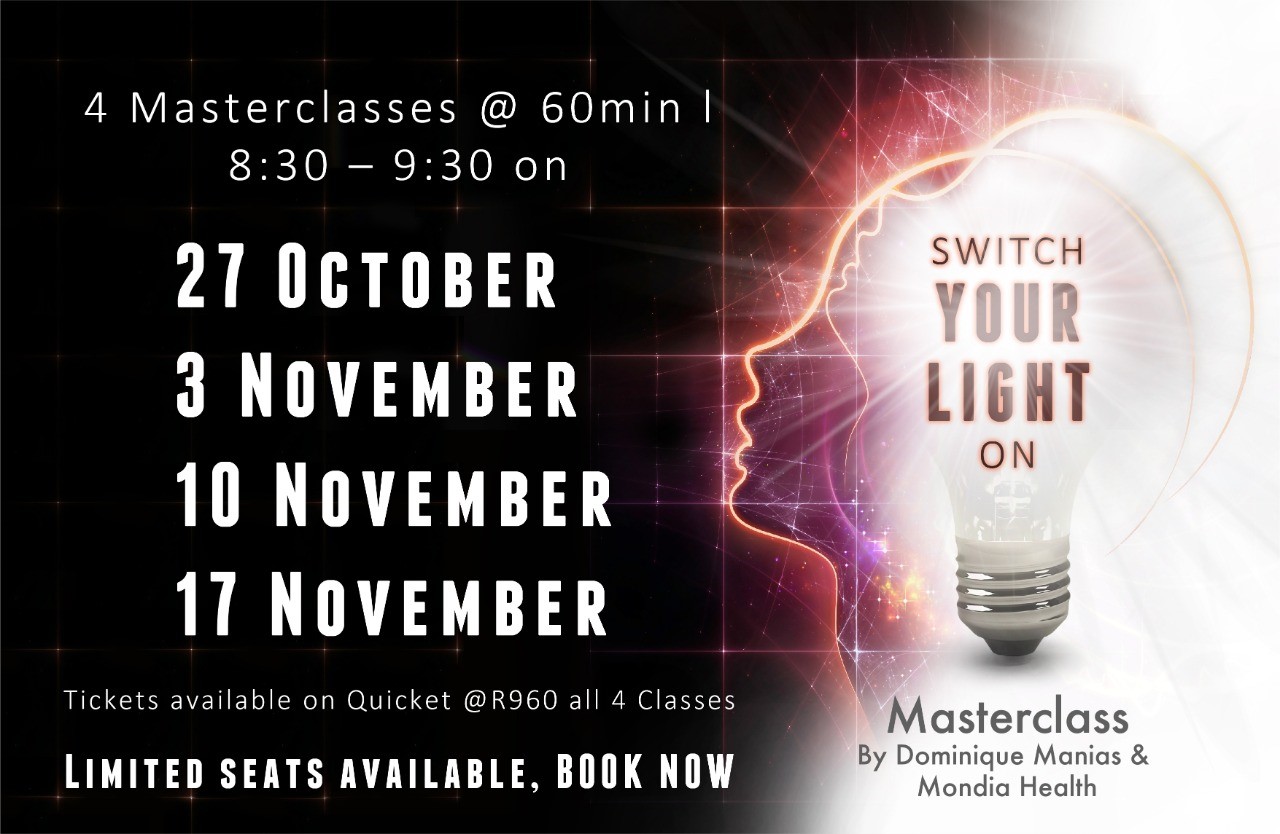 Dominiques Manias, is a Clinical Psychologist and Author of Switch your light on. Her four Masterclasses will be a journey of self discovery that awakens your soul to come into its light so you can shine brightly as your authentic self, offered through your human experience.