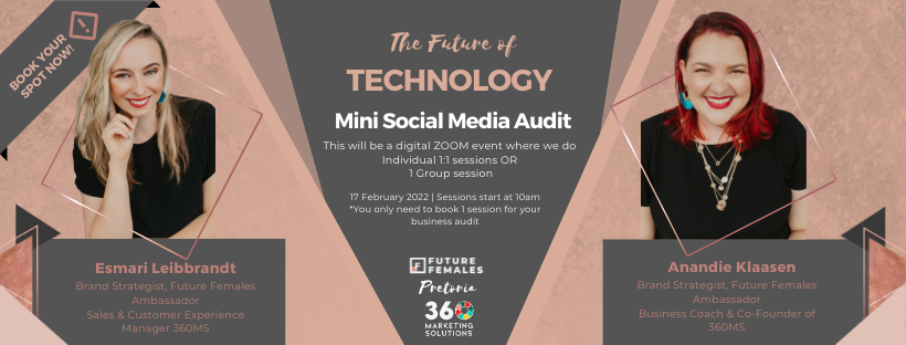 The Future Females Pretoria Ambassadors want to offer you, our community, Mini Social Media Audit sessions with our business and marketing experts, 360MS.