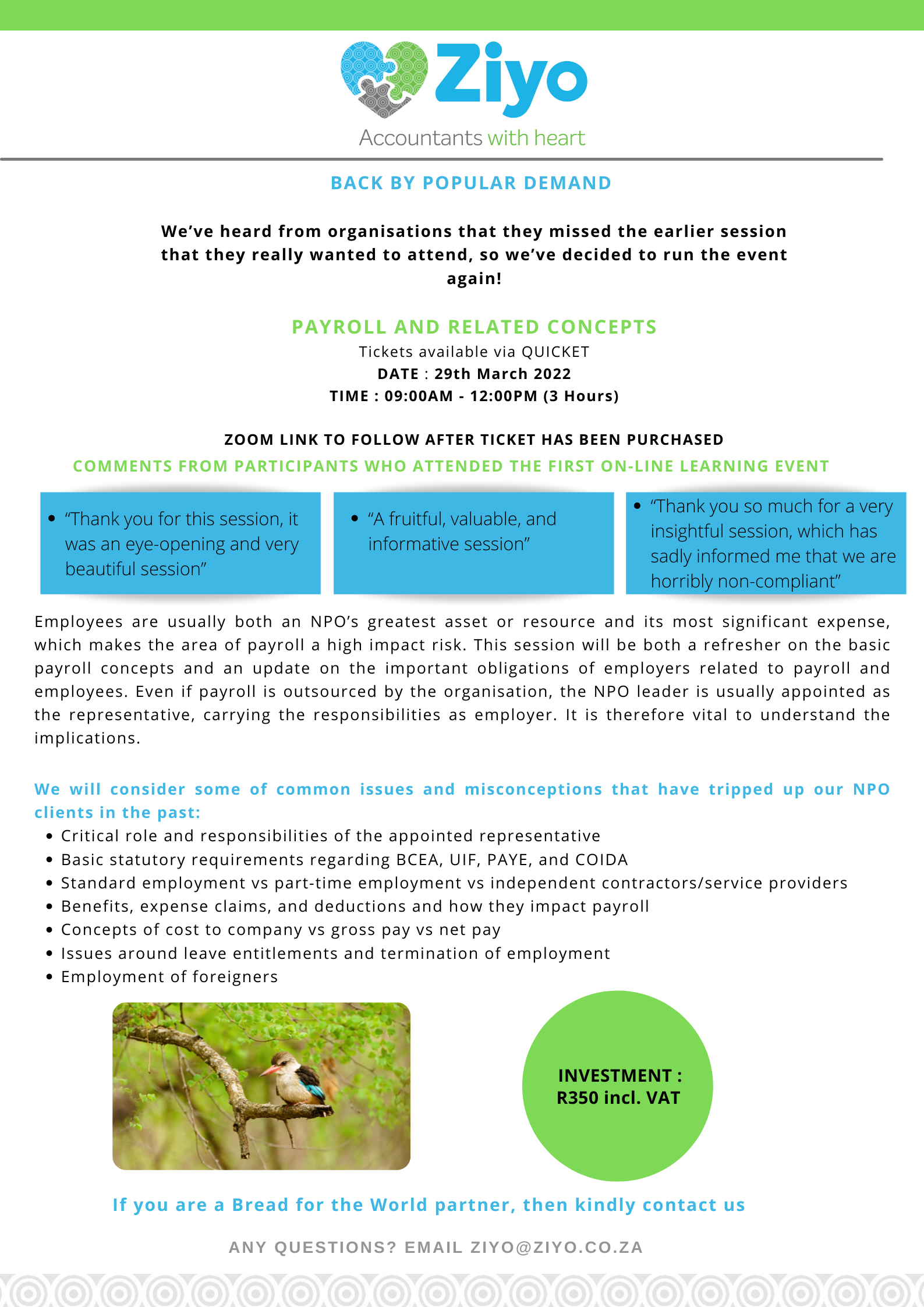 Employees are usually both an NPO’s greatest asset or resource and its most significant expense, which makes the area of payroll a high impact risk. This session will be both a refresher on the basic payroll concepts and an update on the important obligations of employers related to payroll and employees. Even if payroll is outsourced by the organisation, the NPO leader is usually appointed as the representative, carrying the responsibilities as employer. It is therefore vital to understand the implications.