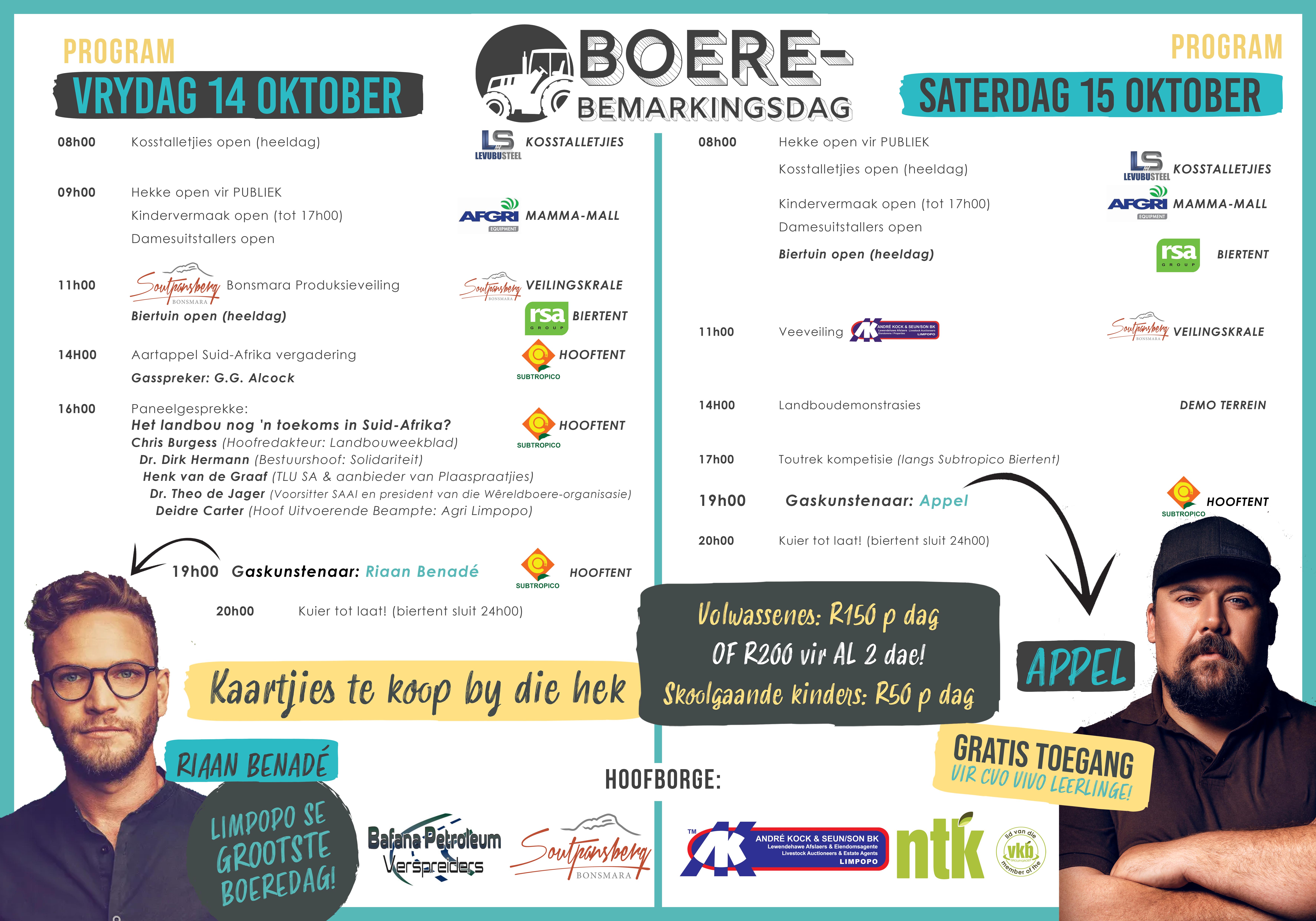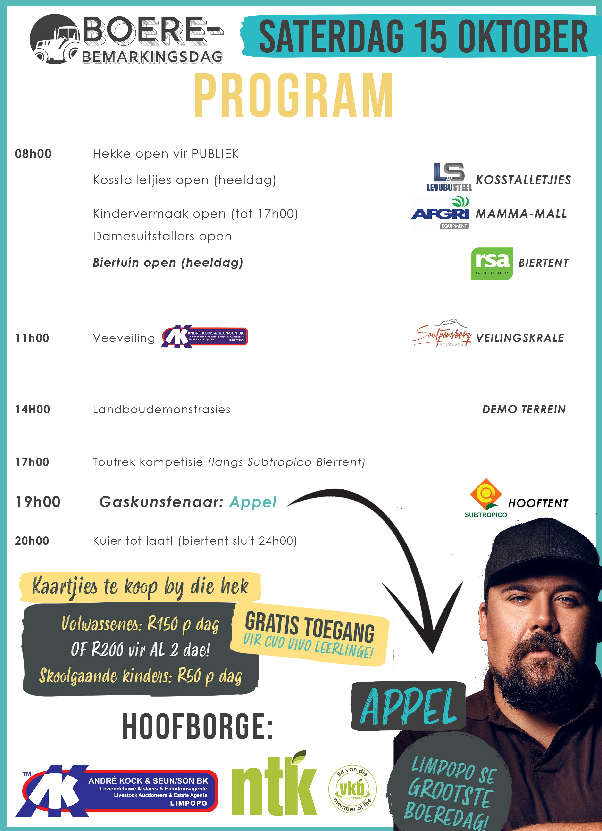 Raak deel as een van ons BORG-UITSTALLERS en maak gebruik van hierdie unieke geleentheid om u besigheid te adverteer en verteenwoordigers te stuur om op ‘n informele wyse u besigheid aan die boere van die HELE LIMPOPO te bemark.