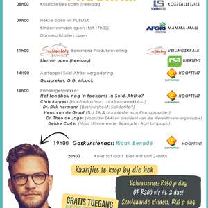 Aktiwiteite vir die dag sluit in bees- en kleinvee veiling, kleiduifskiet, mini-jag-ekspo, voertuigdemontrasies, gaskunstenaars, landboudemonstrasies, toutrek- en kompetisies, damesuitstallers, kindervermaak & heerlike boerekos! KOM BELEEF BOERE GASVRHYHEID OP SY BESTE!