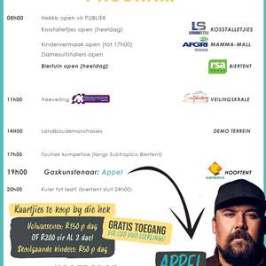 - Tent (alle uitstallers sal onder 'n groot tent gehuisves word)