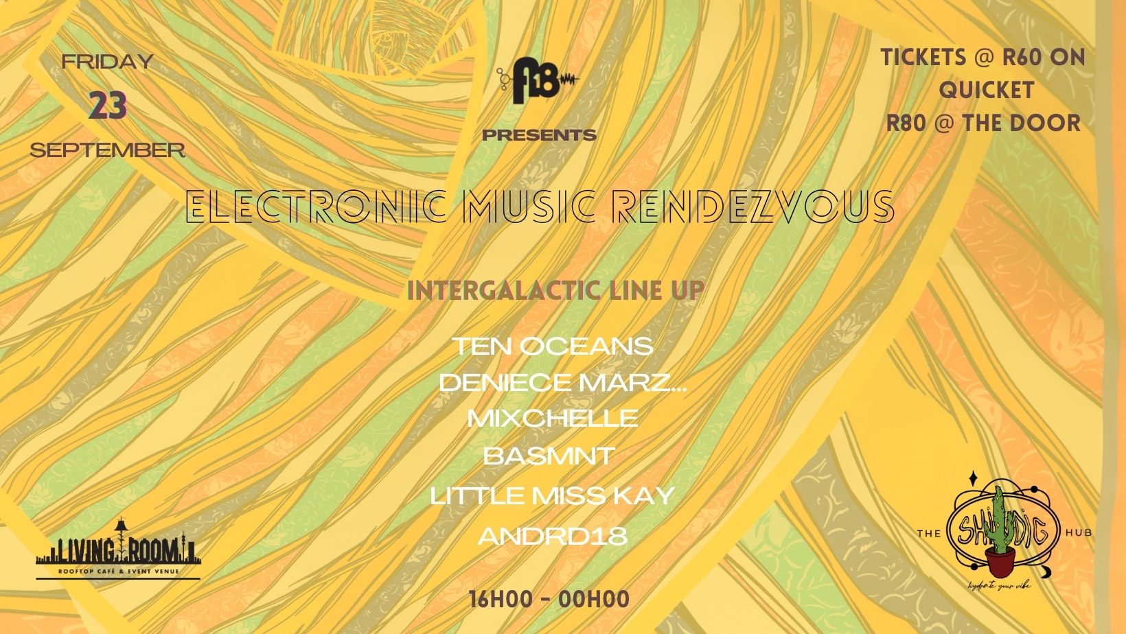 ANDRD18 and The Shindig Hub bring you a third installation of the 'ELECTRONIC MUSIC RENDEZVOUS' at the Living Room in Maboneng. Come through and join us on Friday, 23rd September 2022 as we hydrate your vibe and levitate your music tastebuds.