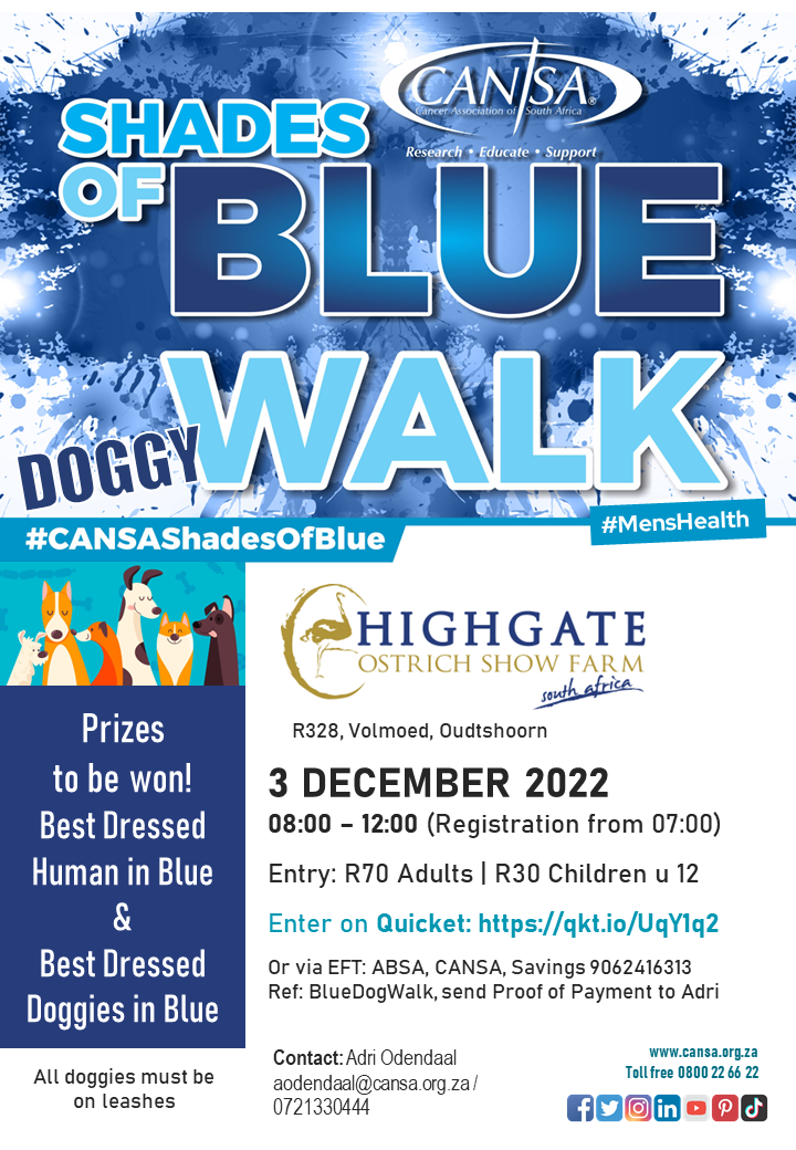 Join us for the CANSA Shades Of Blue Doggy Walk at Oudtshoorn at Highgate Ostrich Show Farm, Oudtshoorn!