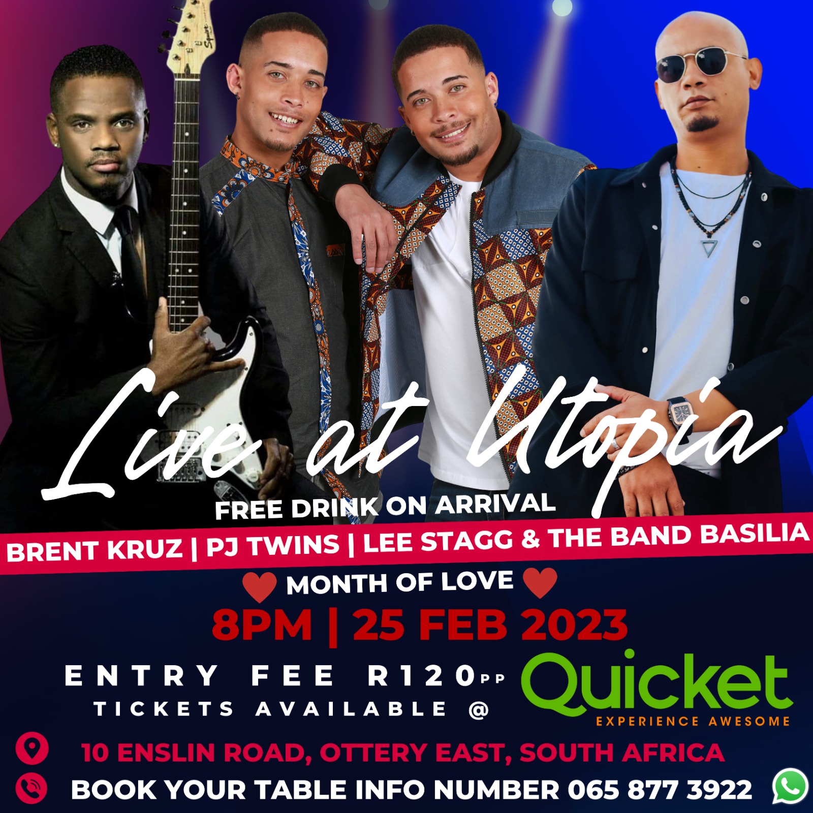 Come and celebrate the month of love with us @ Utopia Café & Lounge on Saturday, 25th February '23 the with the sensational Brent Kruz, The PJ Twins, Lee Stagg & the Band BASILIA. See poster for details