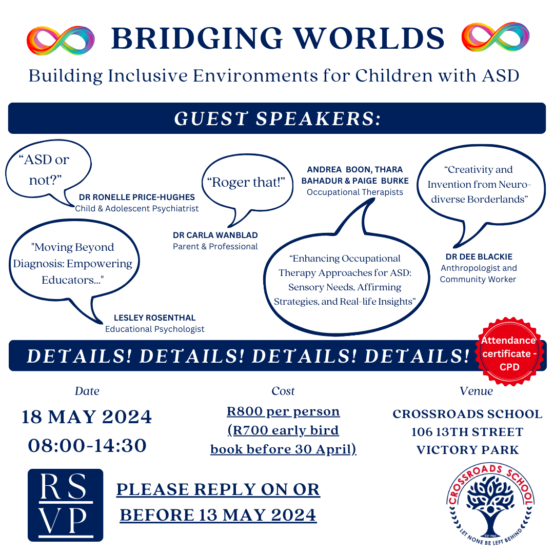 Educational and therapeutic professionals are invited to attend this morning-conference hosted by Crossroads School. The event is filled with guest speakers, specialists in their fields, who will share their expertise and learnings of autism. How to support children with ASD, their families and how to support their education in the school environment.