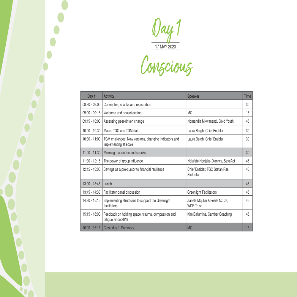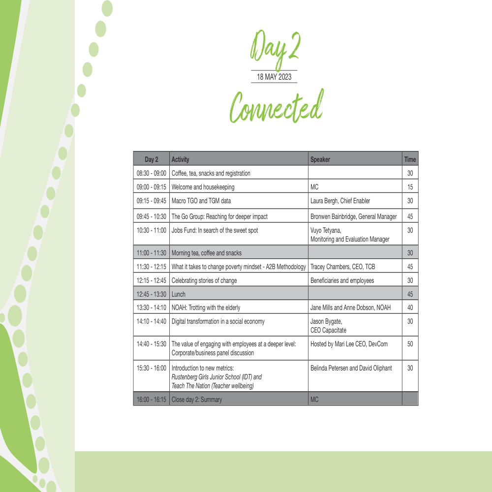 Every second year, the Members and a range of interested external Stakeholders gather to present, explore, share, and collaborate around the insights and learnings from their programmes and impact projects. This conference provides Greenlight Members, attendees, stakeholders, government and universities with key real-time quantitative and qualitative insights into the poverty and development sector.