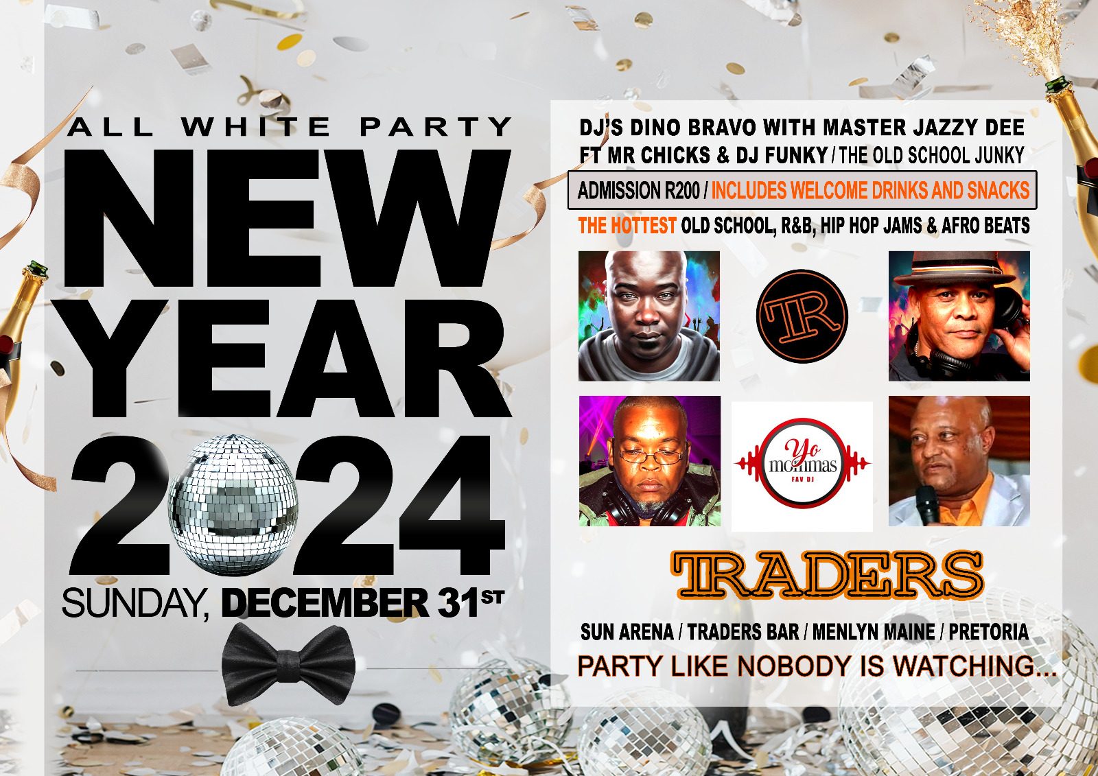 New Year's Eve All White Party At Sun Arena Traders Bar Menlyn Maine Pretoria , 31st December 2023 ADM R200 includes welcome drinks and snacks With South Africa's Hottest DJs To Welcome You Into The New Year 2024 DJs DINO BRAVO with Master Jazzy Dee featuring DJ's Mr Chicks & DJ Funky The Oldschool Junky , Old School Grooves Into The Hottest R&B HiP Hop Jams , Afro Beats Party Like Nobody ,