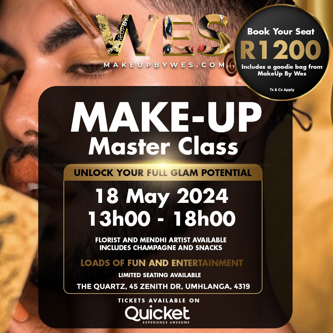 Join us for an opulent 24k Gold-Themed Makeup Master Class by the one and only Makeup by Wes! ? For just R1200, you'll score a ticket to the hottest beauty extravaganza in town. Dive into a world of glitz and glam as Wes himself guides you through the secrets of flawless makeup application, leaving you looking as radiant as a golden sunset. ??