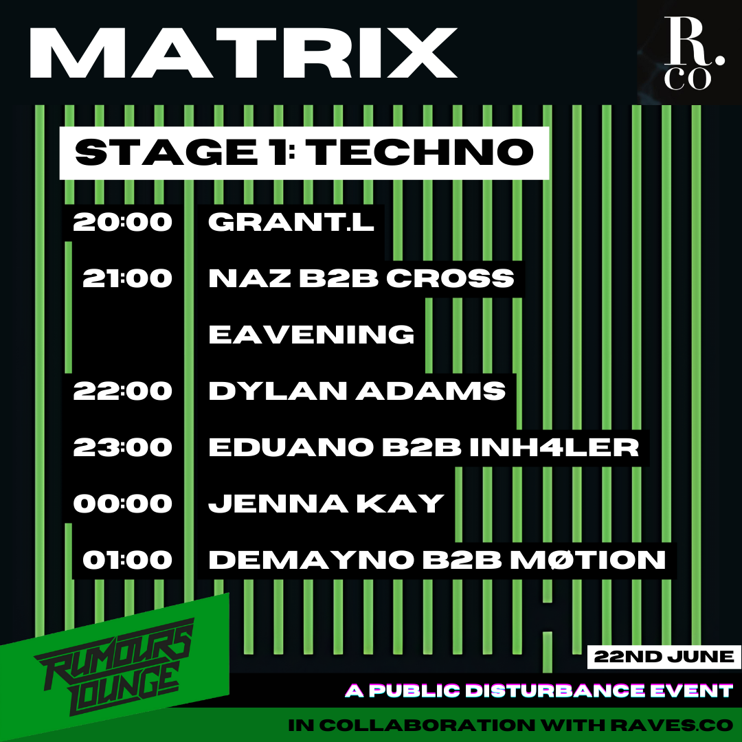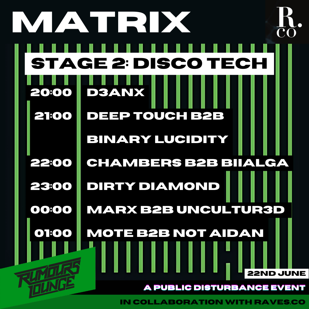 2 Stages, 19 DJs, come join us at Rumours Lounge Strydompark for a night of Techno and Disco Tech.
