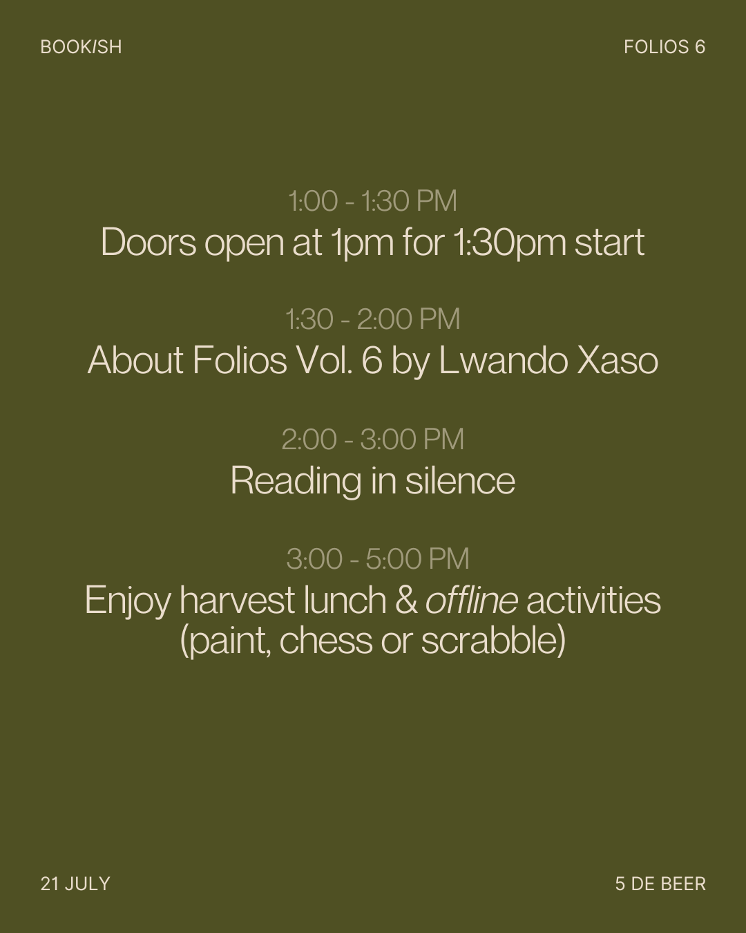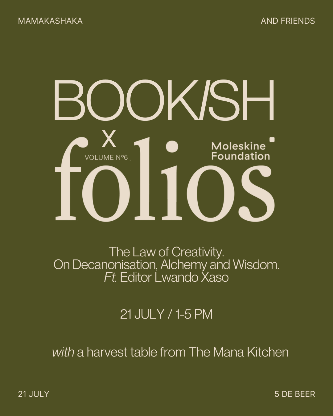 Join us for the 3rd edition of BOOKISH, our literary loving experience where avid readers and aspiring come together to read over a silent hour and enjoy offline activities such as painting, chess or scrabble. In this special edition we have editor of Folios 6, Lwando Xaso joining us as she intro's this latest edition of Folios, the cultural publication of Moleskine Foundation. Each issue focuses on a different meaning of creativity for social change.