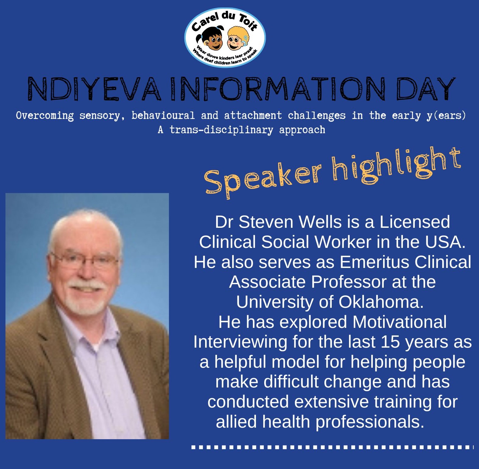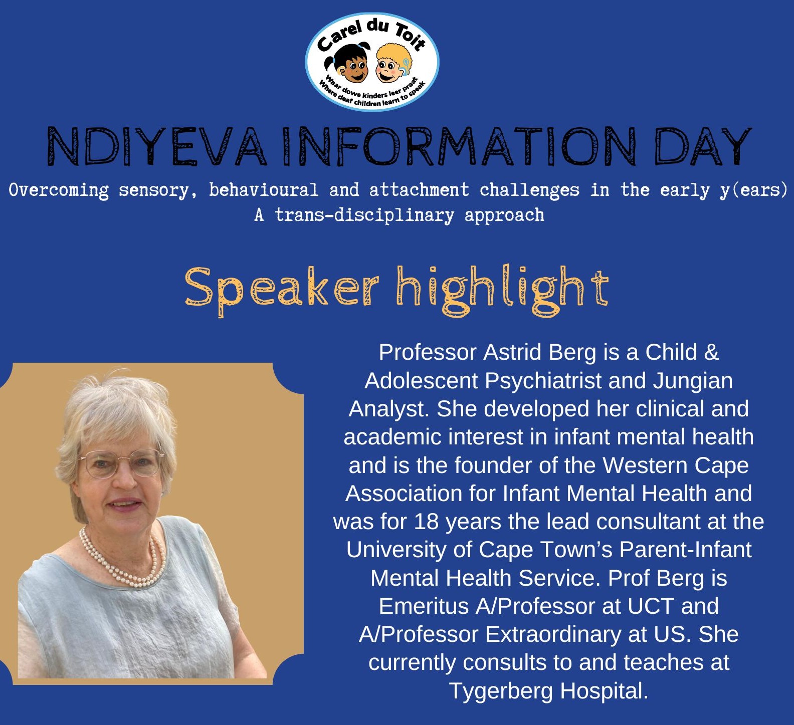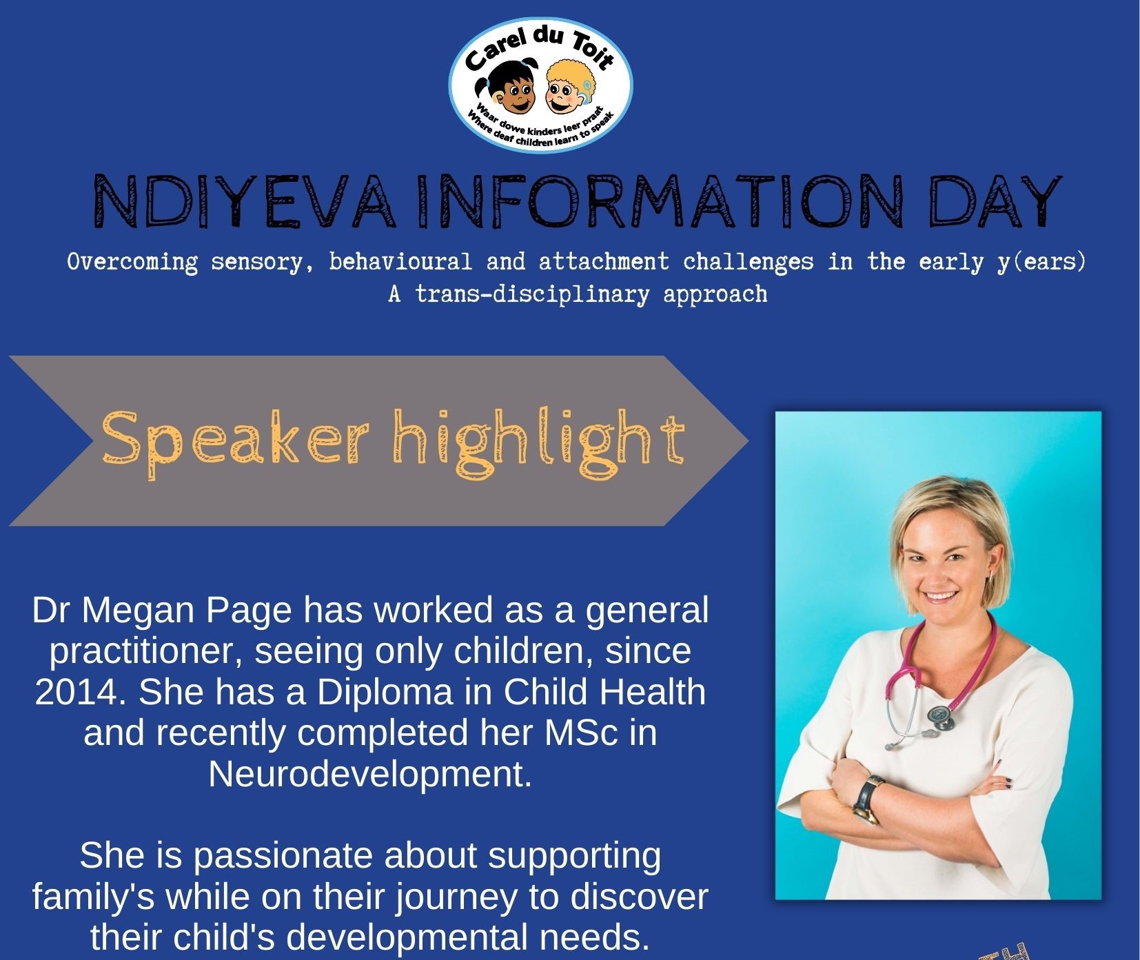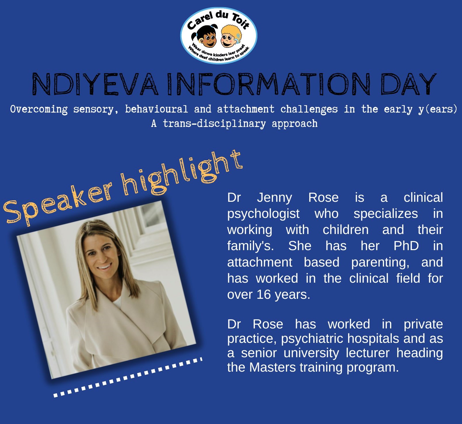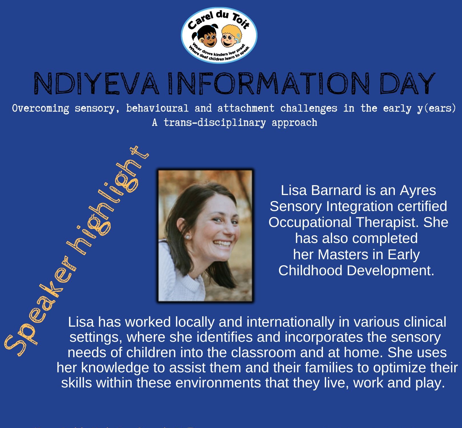 Ndiyeva Information Day provides insight into recent advances in paediatric hearing loss - diagnosis, management, intervention as well as educational support. The program was carefully designed to provide healthcare and education professionals with meaningful theory and practical insights by both local and international speakers. If you work in the paediatric therapuetic or healthcare sector or are one of the many team members involved in working with children with hearing loss, then we encourage you to listen and learn about overcoming sensory, behavioural and attachment challenges in the early years.