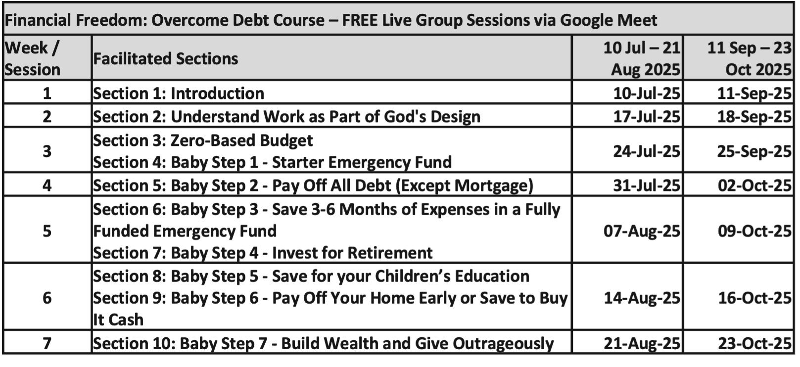 - Join our live group sessions via Google Meet. These sessions are a great way to ask questions, share insights, and connect with others. Google Meet link will be on your ticket. Feel free to attend all or one of these live group sessions via Google Meet on Thursdays from 18:30 - 20:00 (South African Time). Kindly complete Section 1 of the Financial Freedom: Overcome Debt course before the start date of the live group sessions.