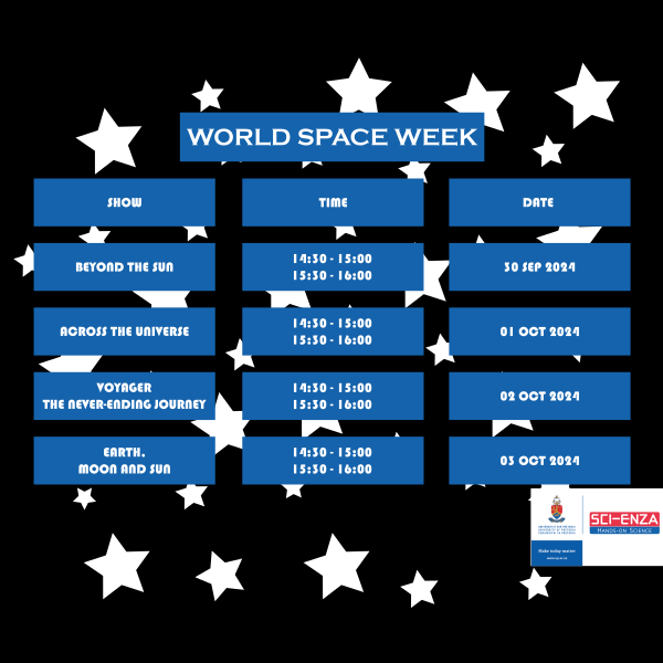 Join in celebration of the World Space Week hosted by Sci-Enza Science Centre, University of Pretoria under the theme “Space and Climate Change”. A variety of planetarium shows will be showcased for four days. There will be two sessions per day.