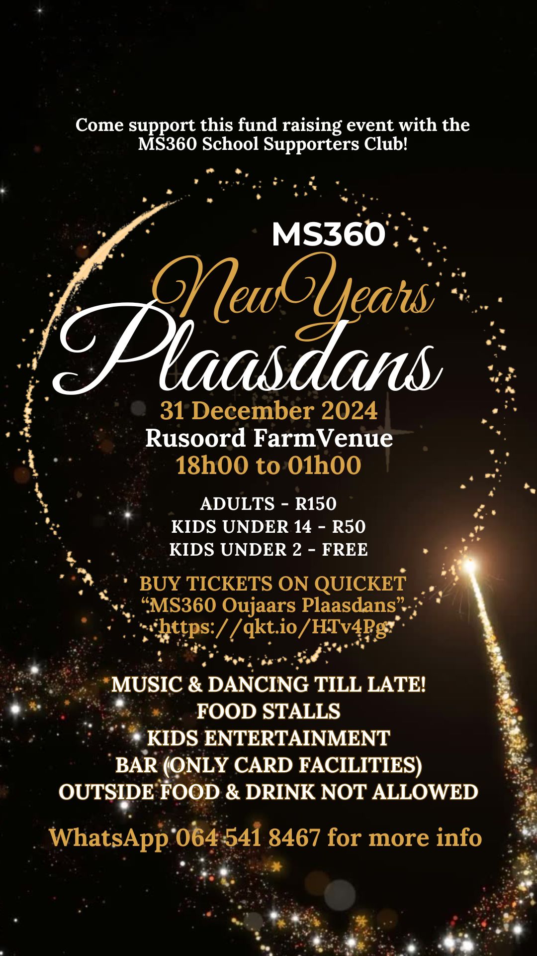 MS360 Ondersteunersklub bied 'n Oujaars Plaasdans aan om fondse in te samel vir 'n Graad RRR tot Graad R-nasorg wat in Middelburg Oos-Kaap gevestig word. Die geleentheid vind by Rusoord Plaas Venue se skeerskuur plaas - 'n pragtige plaas venue geskik vir 'n tradisionele "Plaasdans" waar die gemeenskap gaan saamkom en die Ou Jaar vier met lekker kos en musiek vir 'n goeie doel! Daar sal 'n kroeg (slegs kaart-fasiliteite) en kosstalletjies wees, asook 'n area vir kinders - bring jou kleingoed se kombers en kussing saam sodat hulle gemaklik kan wees vir 'n fliek-aand. Deure maak 18h00 oop en sluit om 01:00 die volgende oggend. Geen drink- en eetgoed van buite toegelaat. KAARTJIES SAL OOK BY DIE DEURE VERKOOP WORD - SLEGS KAART FASILITEITE (GEEN KONTANT!).