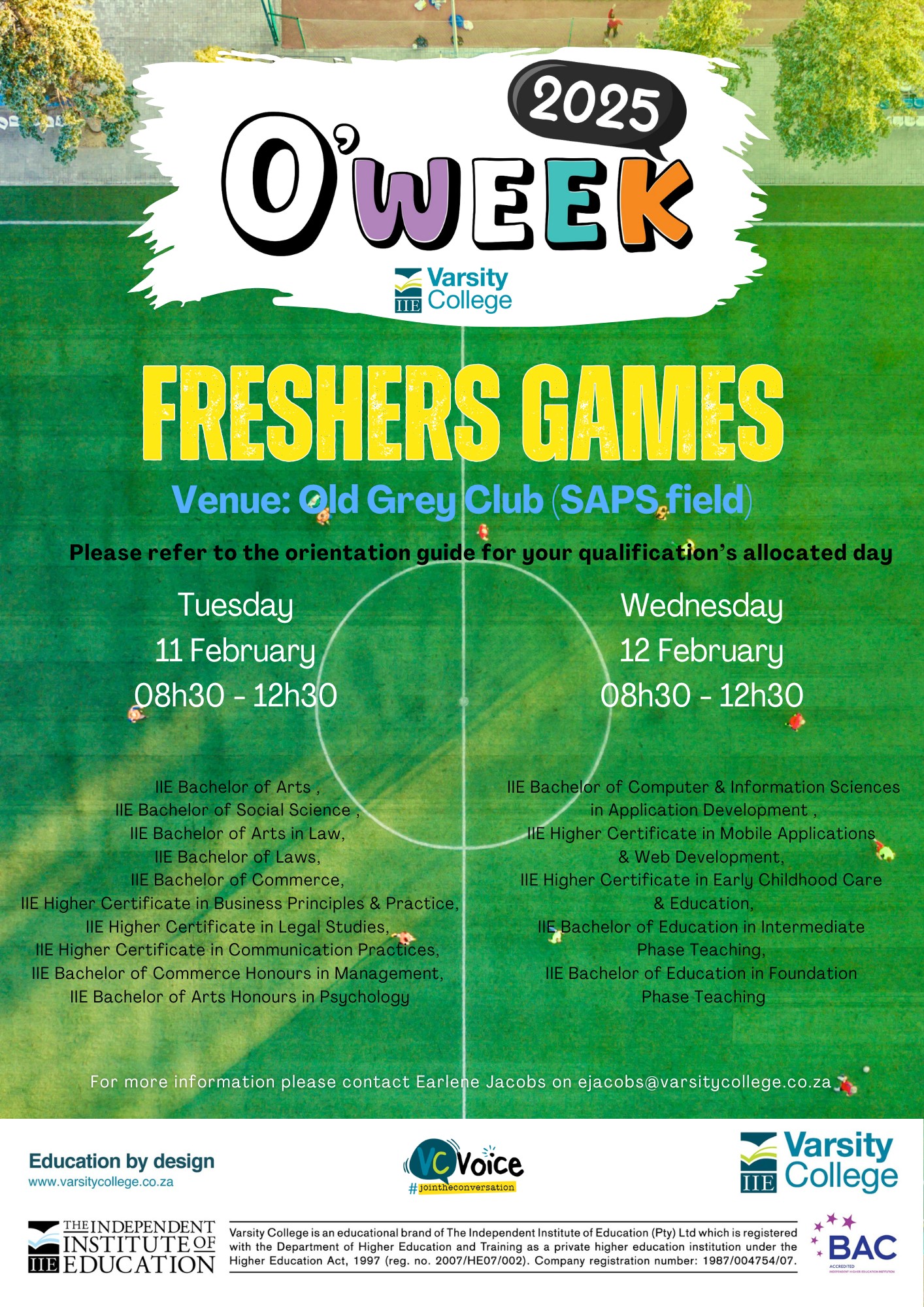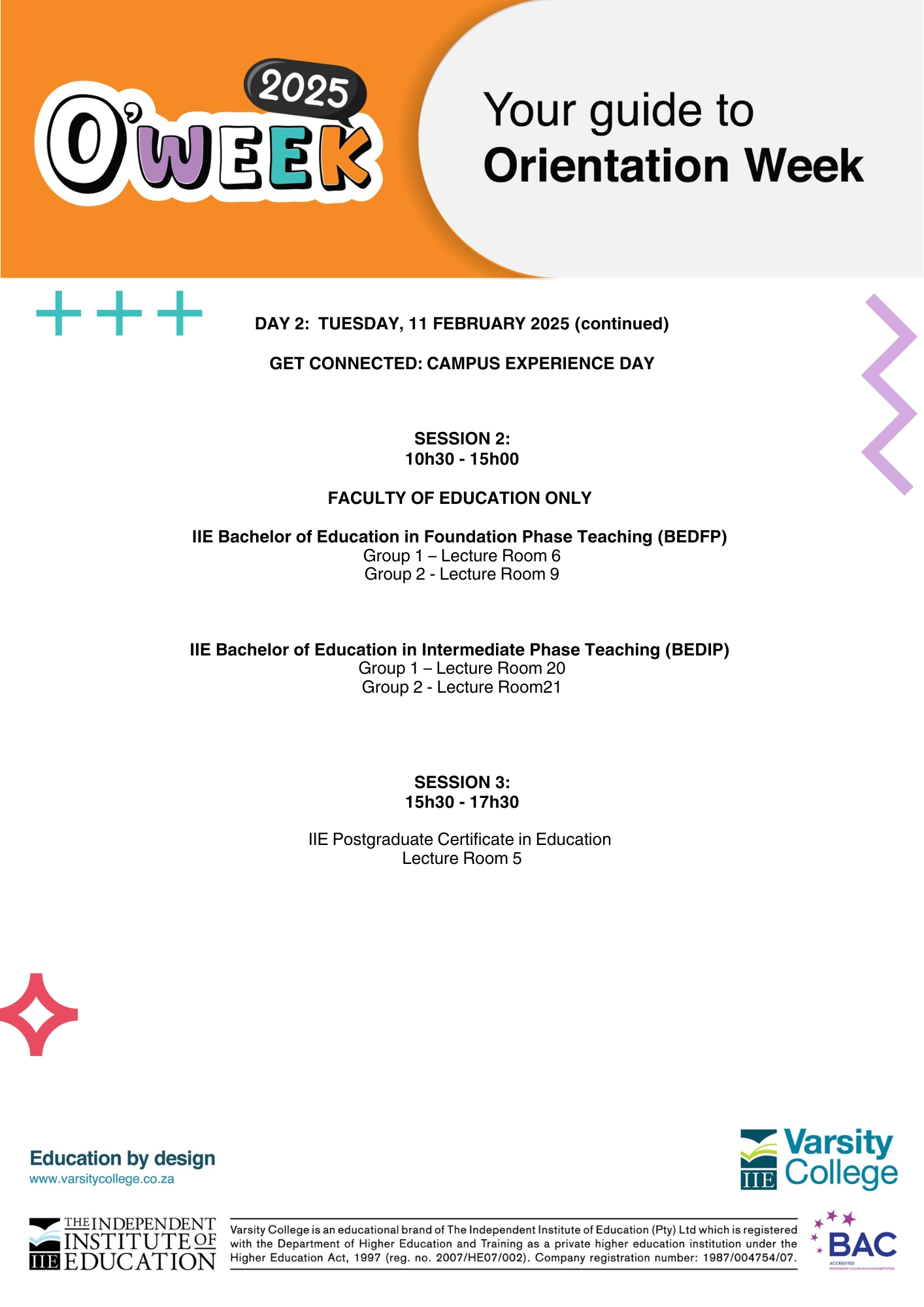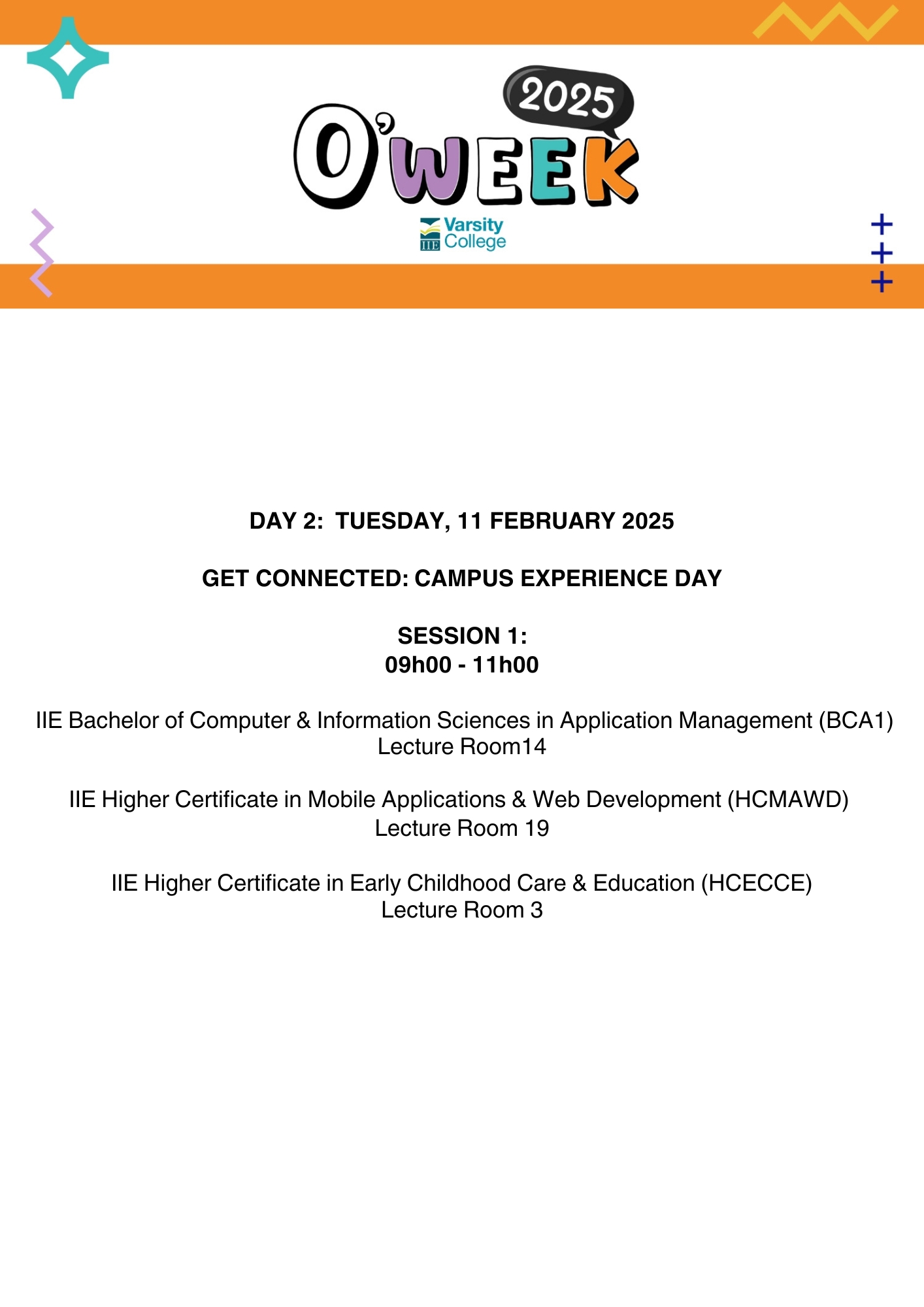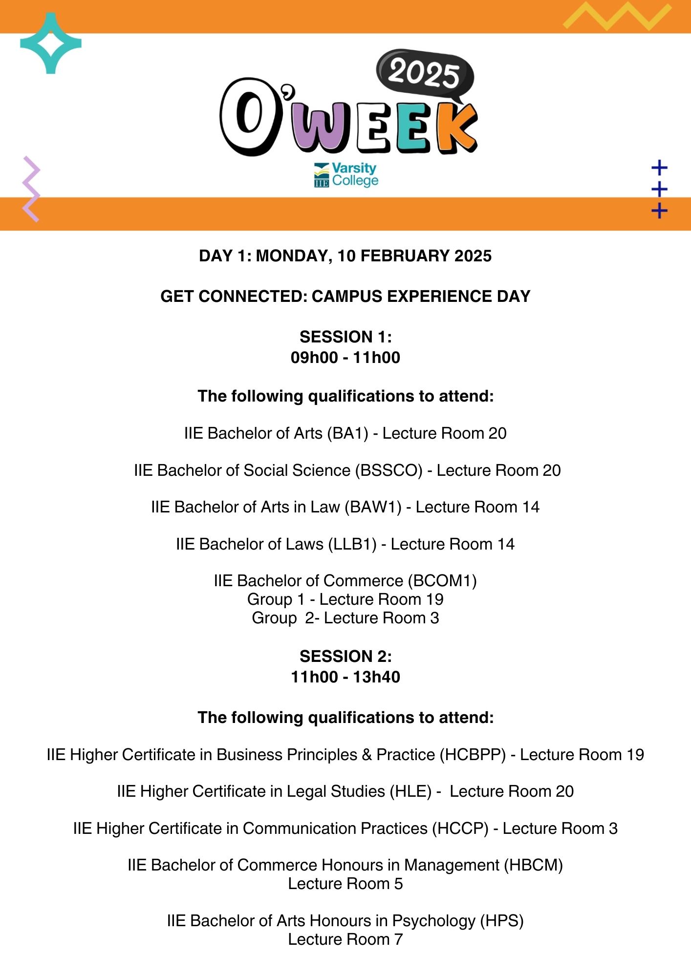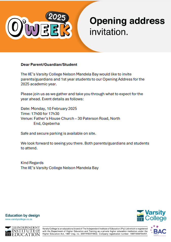 For more details on each of the above day's activities, visit the IIE Varsity College Website https://www.varsitycollege.co.za/orientation and download the Orientation week guide for the Nelson Mandela Bay Campus.