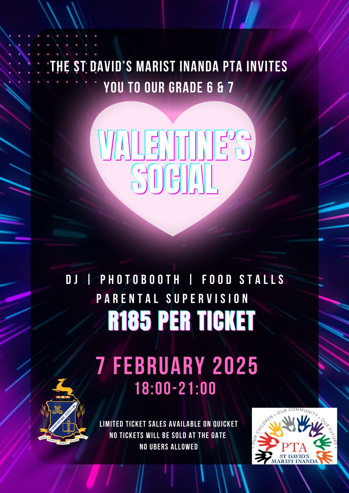 If you are in Grade 6 or 7 you are invited to join us for a social, with a DJ, food stalls and a photo booth.