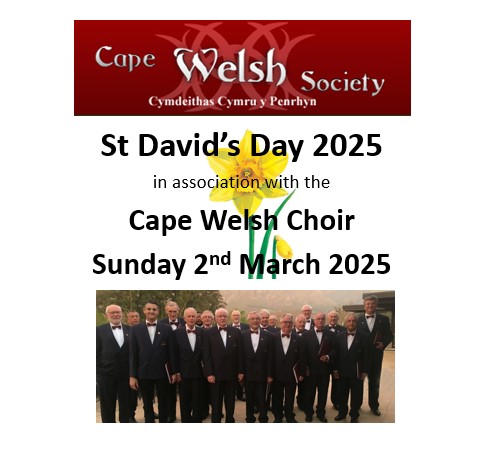 Please join us to commemorate Saint David, the Patron Saint of Wales, for a wonderful afternoon with the Cape Welsh Choir followed by a sing song. "Friends of Wales" are invited to spread the word and join us for a mini-concert with the Cape Welsh Choir followed with what the Welsh do best - a lively sing song in the bar thereafter. We look forward to welcoming you all to what promises to be a memorable afternoon filled with laughter, fun and friends.
