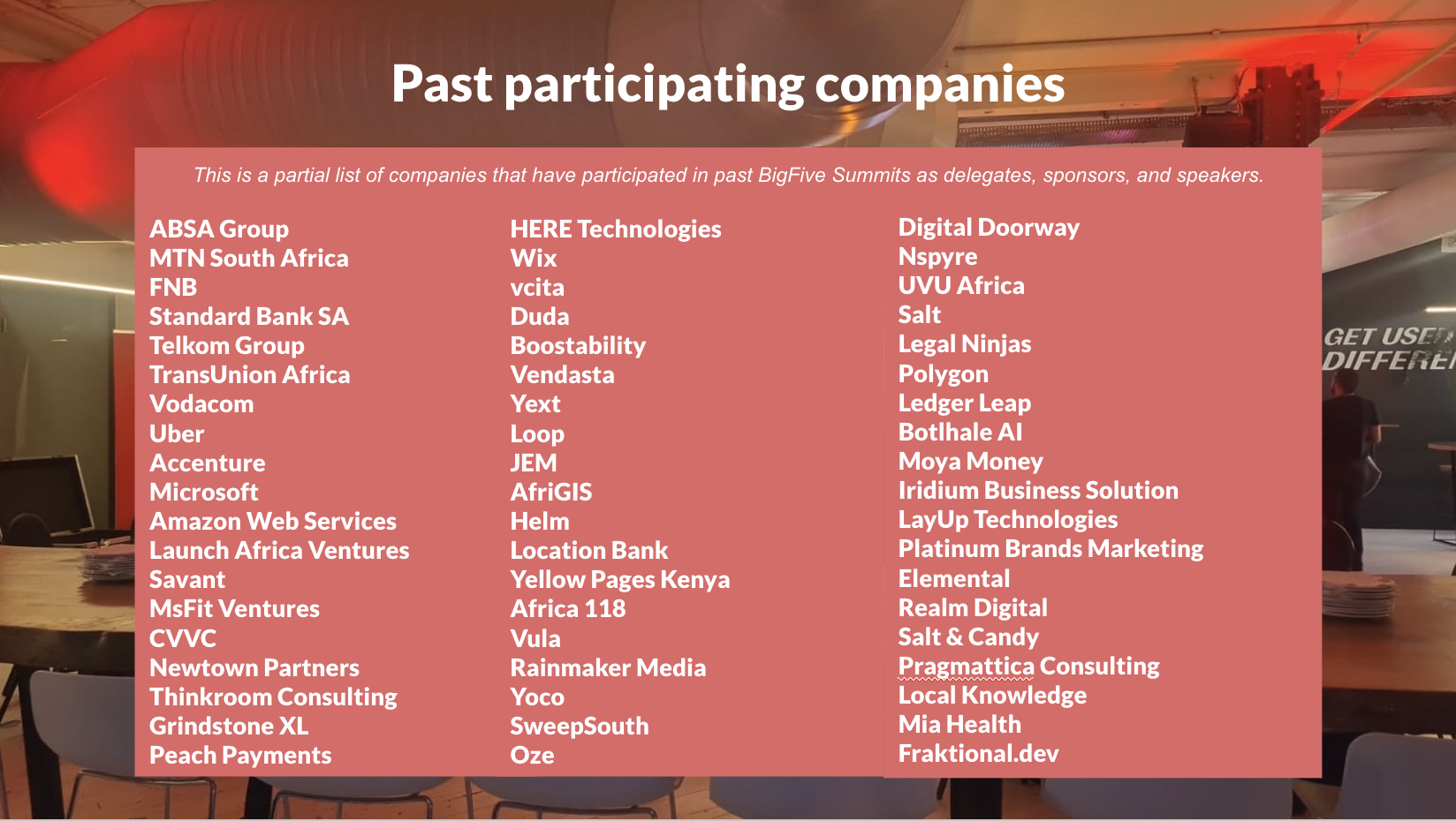 The BigFive Summit offers a unique opportunity for aggregators of African businesses (banks, telecoms, digital agencies, media platforms) to interact with the builders of B2B tech (startups) and those funding the innovation (VCs).