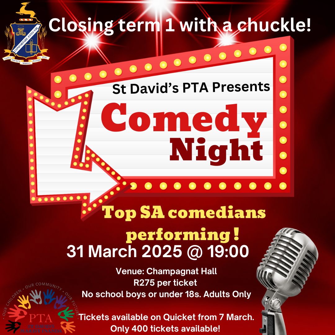 After a busy first term, the St David's PTA brings you an evening of laughter and good company for the grown-ups - with a line-up of some of South Africa's top comedians: