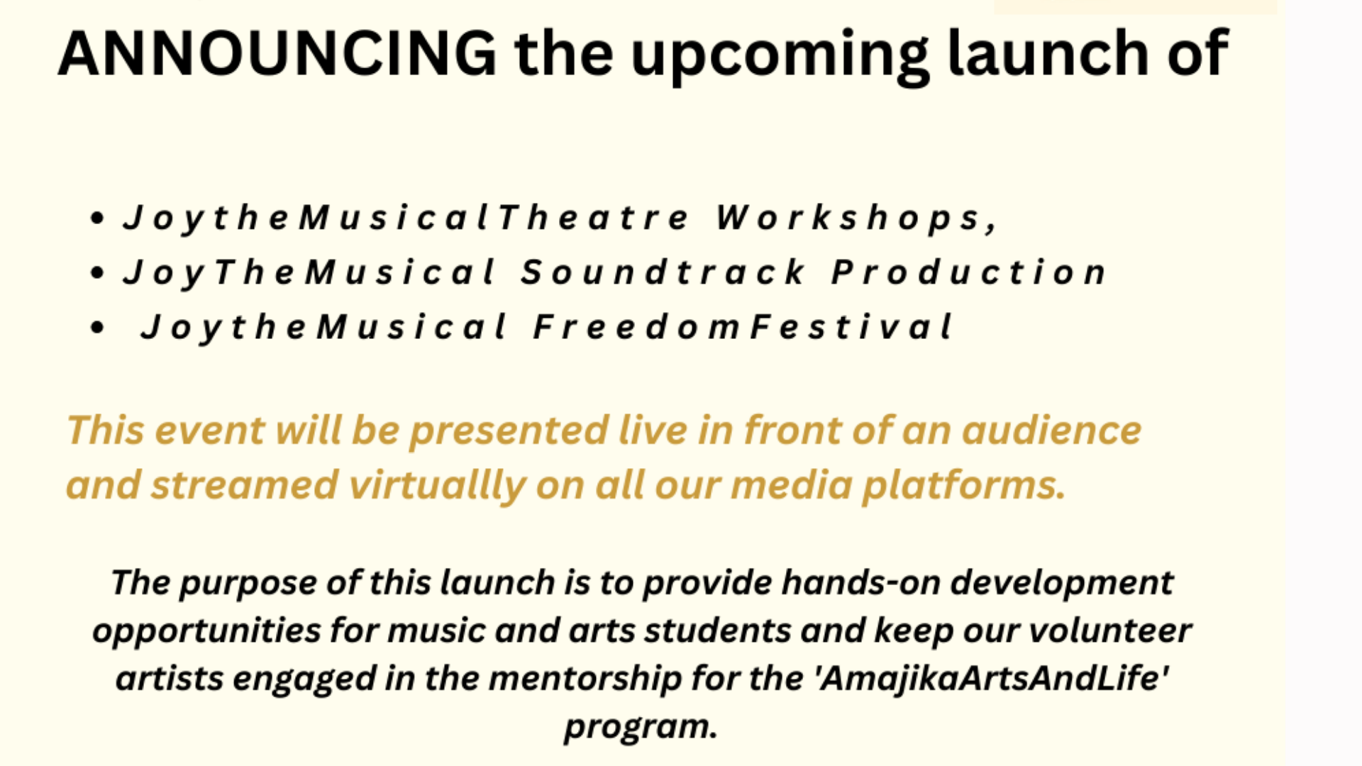 We are excited to launch a callout for talent from the SADC region in February 2025. This is your chance to be part of something extraordinary! Stay updated and subscribe to #joythemusical for more information on auditions and participation.