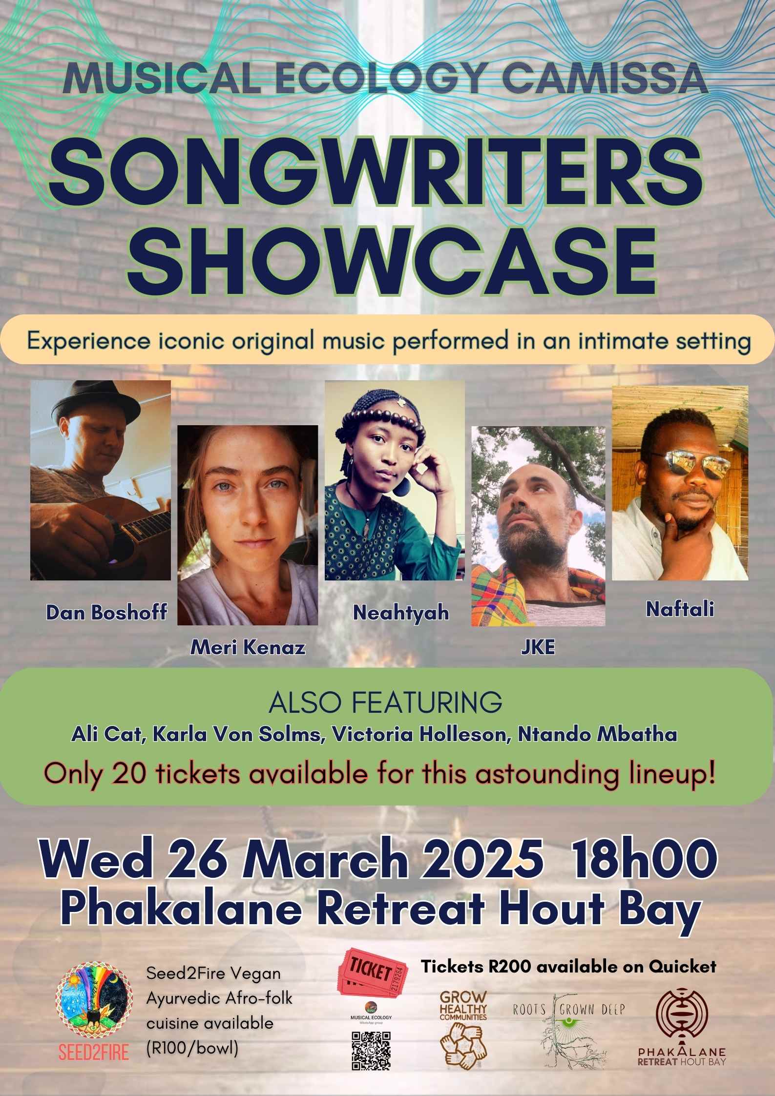 Our songwriters showcase feature an astounding lineup of musicians: Dan Boshoff, Meri Kenaz (aka Meri Kanu, Neahtyah, JKE (Joel Karabo Elliot of Roots Grown Deep), Naftali, Ali Cat, Karla Von Solms, Victoria Holleson, Ntando Mbatha.