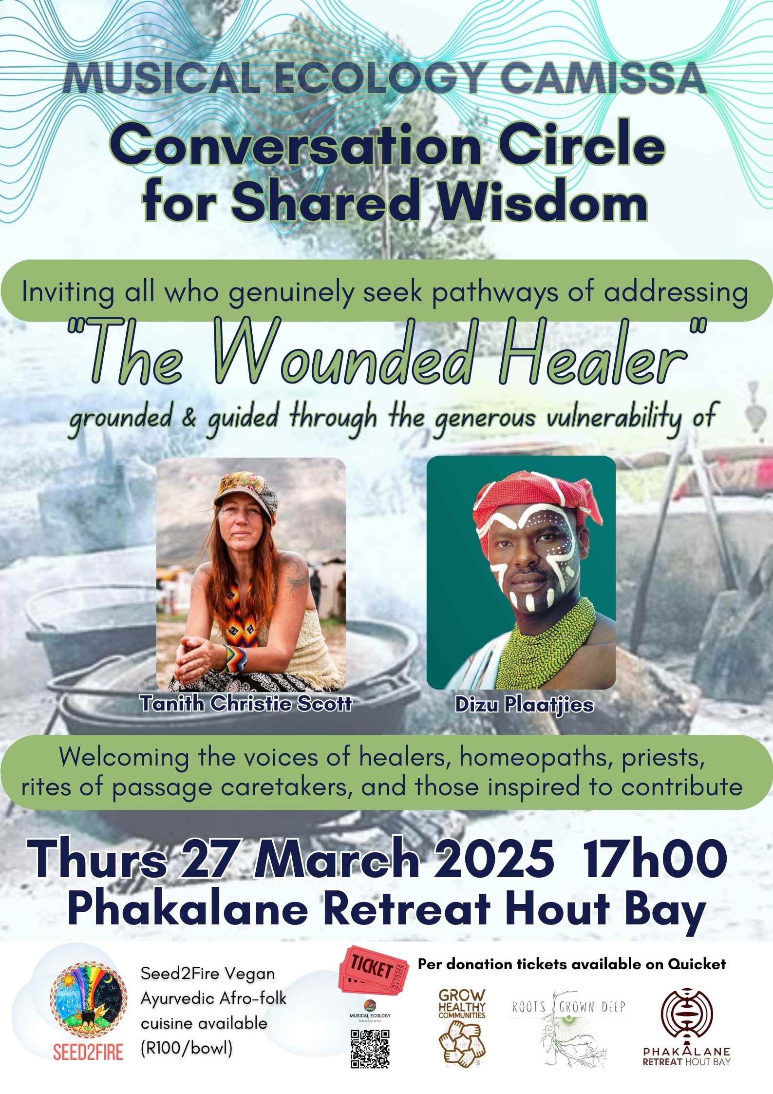 Join us in this fireside conversation circle in the beautiful indigenous garden of the Phakalane Retreat space. Anchored by Tanith Christie Scott and Dizu Plaatjies, we also welcome the voices of healers, homeopaths, priests, rites of passage caretakers, and all inspired to contribute in kind authenticity.