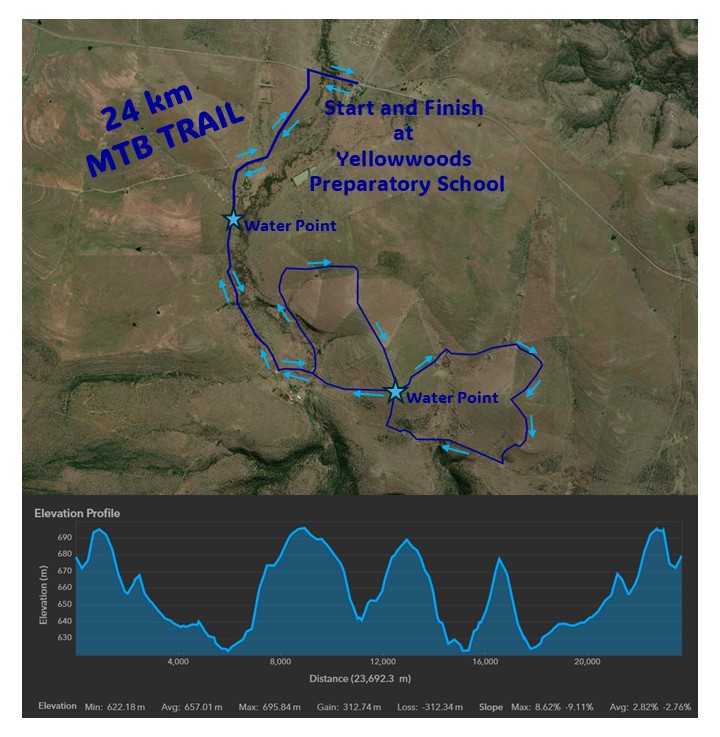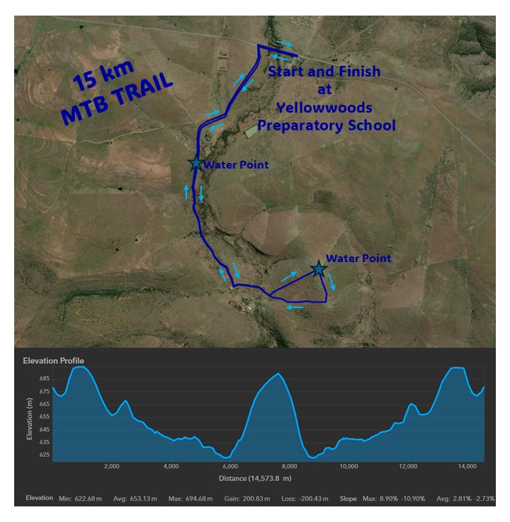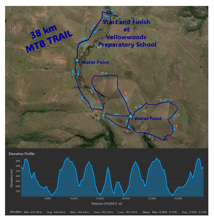 Our Longest MTB route, leaving from the start at the school, and riding along dirt roads to the neighbouring farm, you will do clockwise 14km loop followed by an anti-clockwise 14 km loop of the farm. The route will take you through livestock camps and then return to the school to the finish.