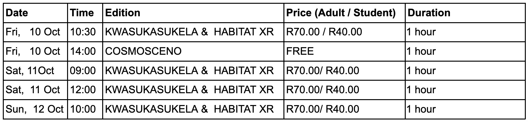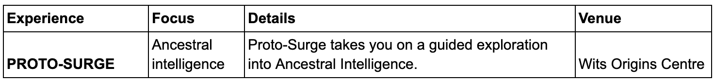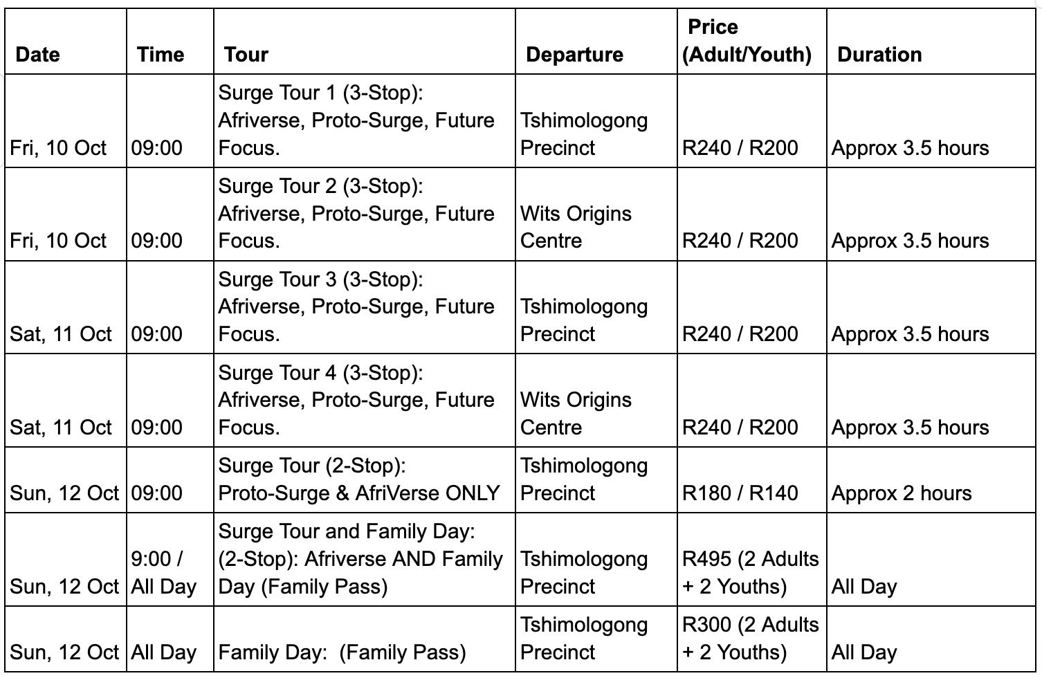 Festival Tour Pass: Powerful 2 and 3-stop immersive tours connecting the Wits Digital Dome, Wits Origins Centre and Tshimologong Digital Precinct via shuttle. NOTE: Different departure points for each tour.