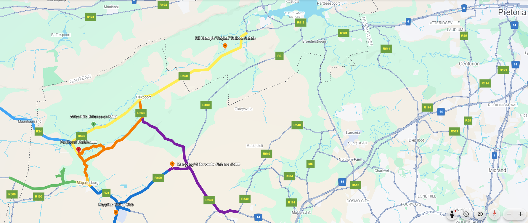 - Maloney’s Route (Dark Blue): Route 24(S) Southern Magalies River - approach from Krugerdorp / Roodepoort