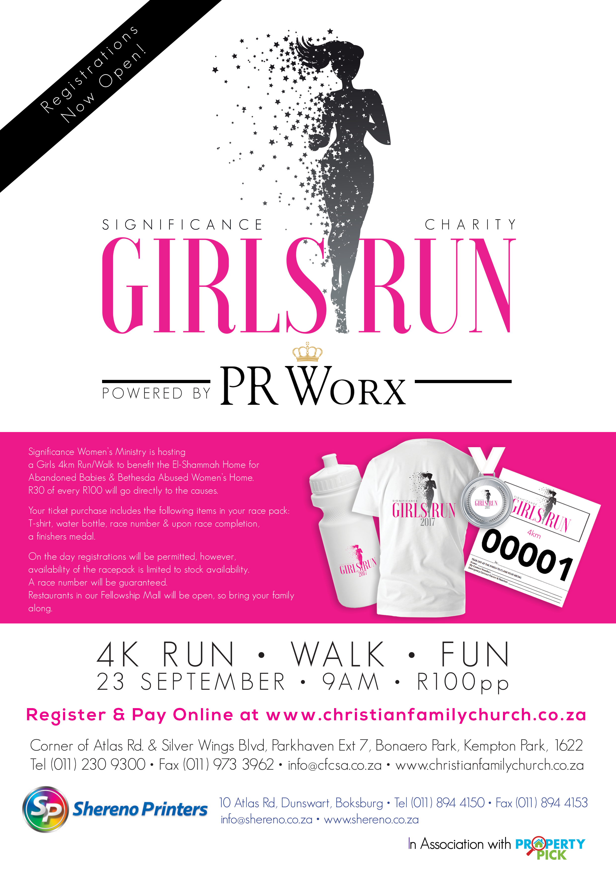 Race packs will be available for collection from the I AM WORTHY Boutique at Christian Family Church in Bonero Park on weekends. You can also contact Christine Wilmans at [email protected].