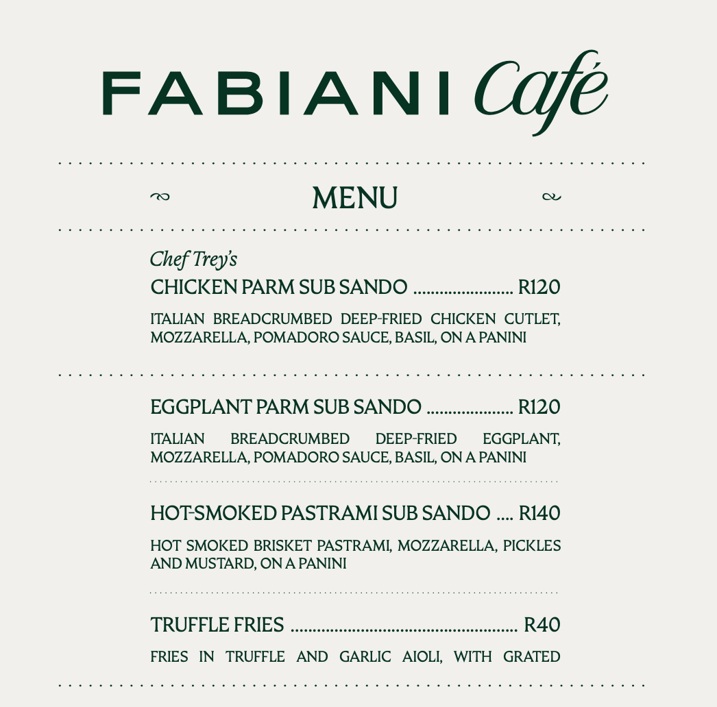 Expect a menu prepared by Chef Trey, Italian deli-style sandwiches, inspired by the corner bodegas of Italy, made fresh using locally sourced ingredients, many of which are supplied through the FoodForward SA local network.