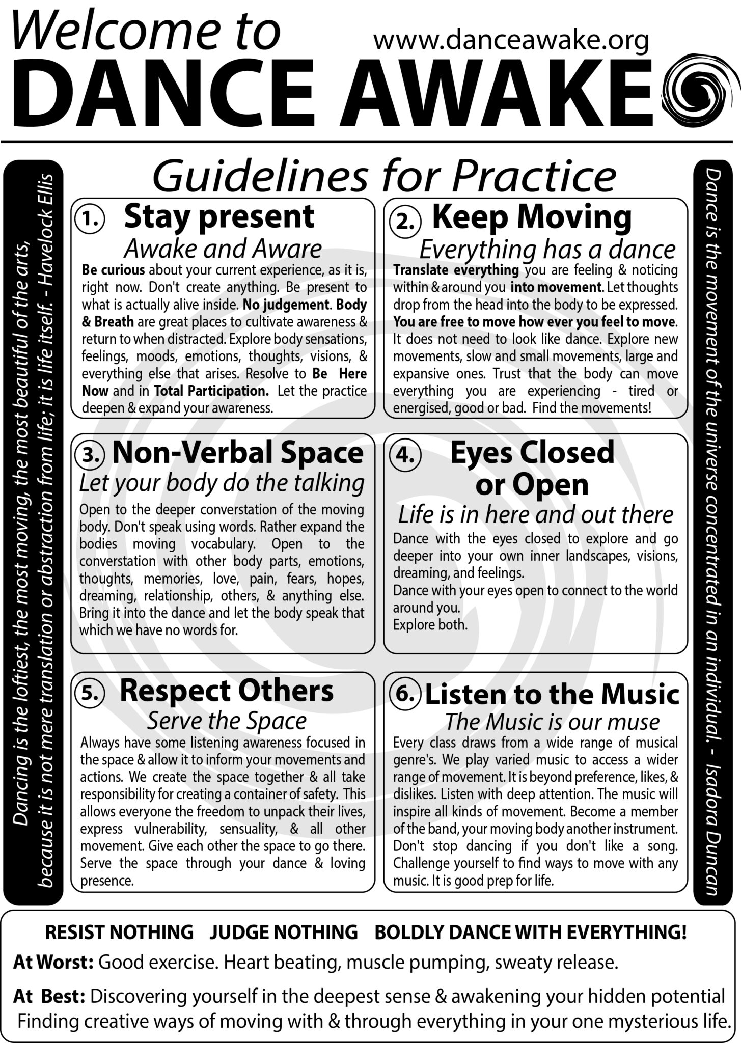 Dance Awake is a conscious dance practice of exploring all the dimensions of one’s own being. Through movement we access our own inner wisdom. It is a practice that supports physical, mental, and emotional well being. Each practice is supported by a wave of great music, simple guidelines and open-ended facilitation.