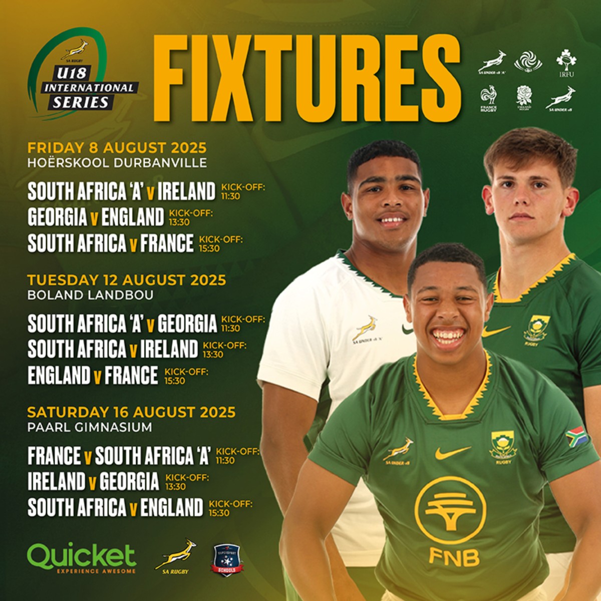 Join us for an unforgettable day of top-tier youth rugby as some of the world’s most promising young talents go head-to-head in the U18 International Series at Paarl Gimnasium! Come and witness the future stars of international rugby battle it out in a thrilling triple-header.