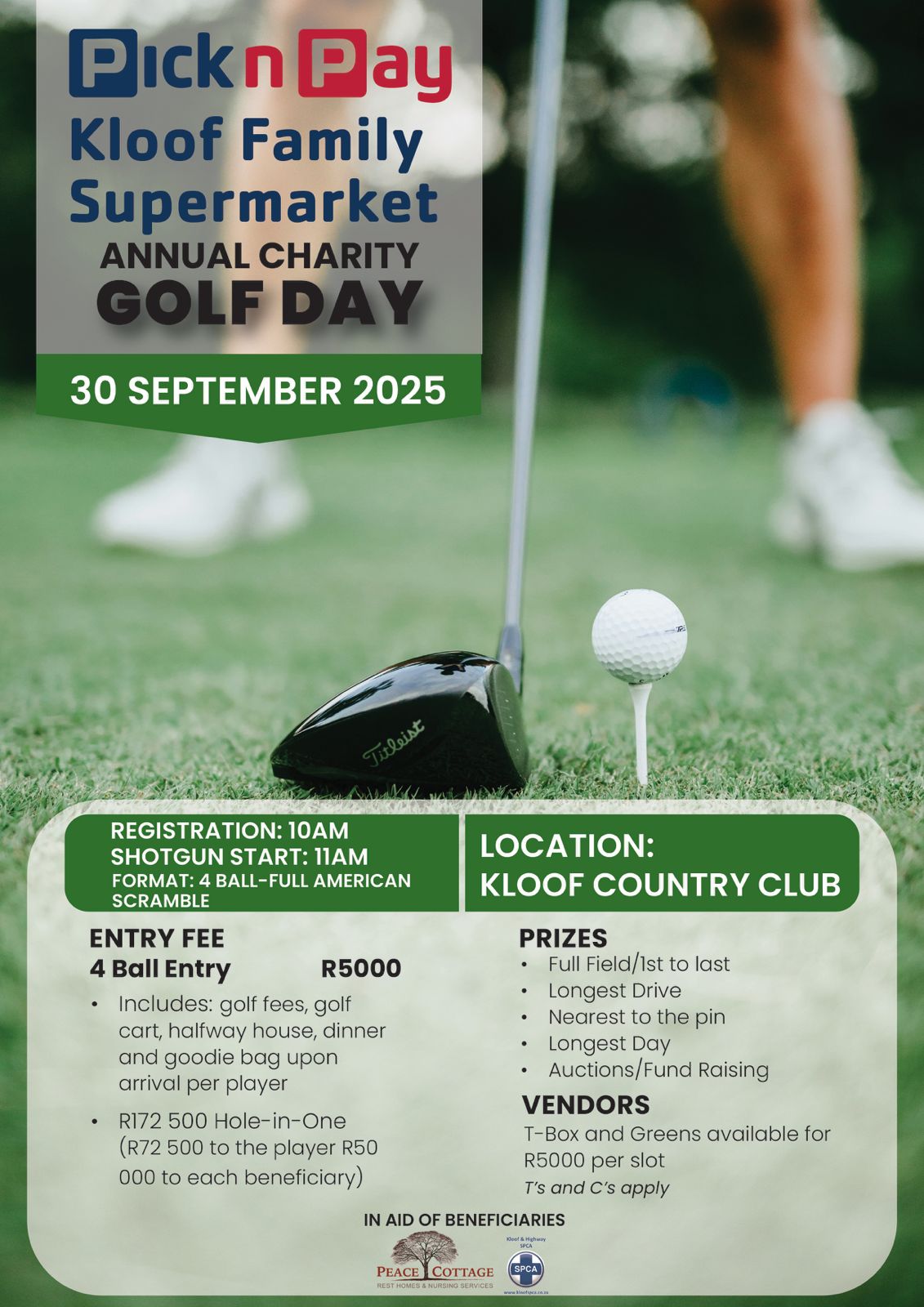 We have limited Tee Box’s and Greens available for sponsorships at the Pick n Pay Kloof Annual Charity Golf Day @ only R5,000 per hole!