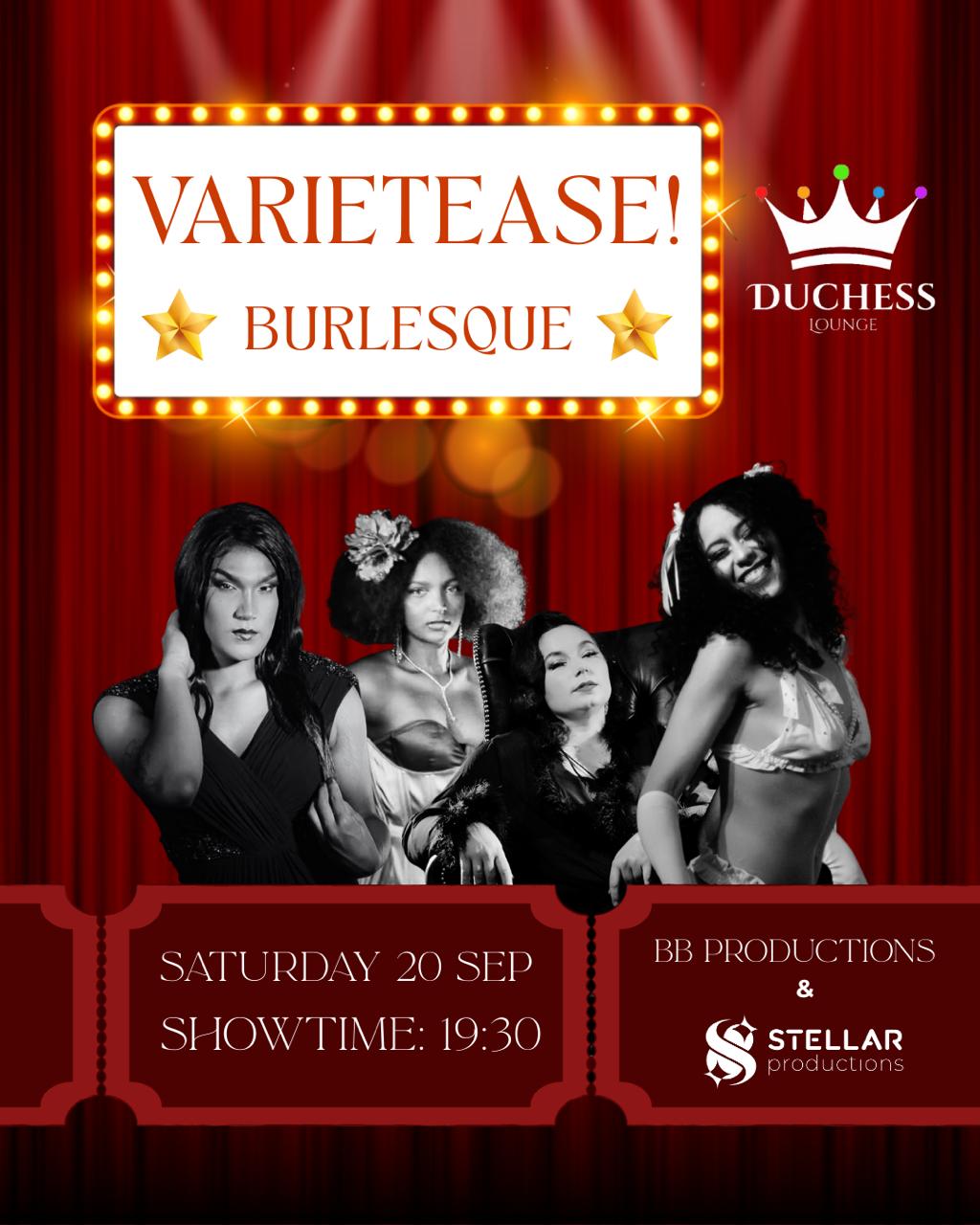 Step into a world of glamour, seduction and spectacular showbiz as VarieTease! brings its signature blend of burlesque, live singing and dazzling drag to one of Cape Town’s hottest new queer venues Duchess Lounge