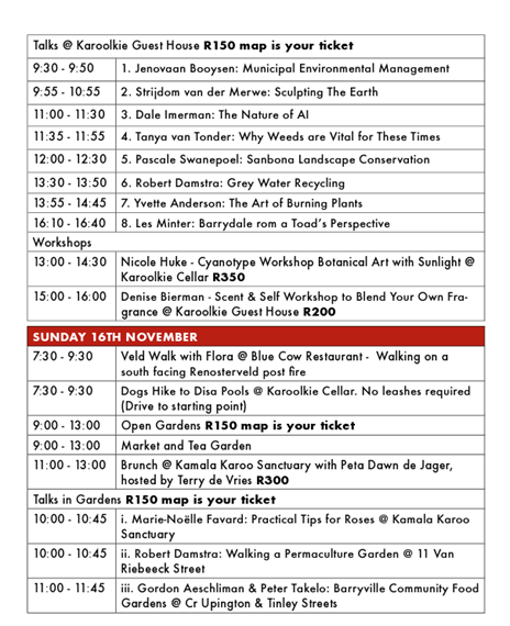 A leisurely Sunday brunch will be prepared by foodie Peta-Dawn de Jager on the deck of Kamala Karoo Sanctuary, or choose to attend free specialist talks in various gardens by experts and enthusiasts on subjects ranging from rose – and water wise gardening, to community food gardens and river restoration work.
