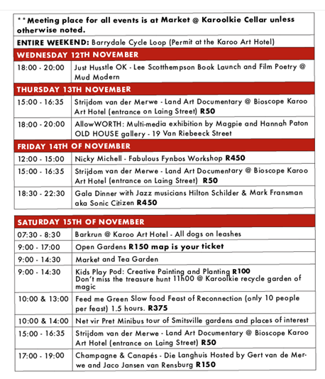 All Saturday talks take place at the Karoolkie Guest House (entry included in Map Booklet price). Our lead speaker for the festival is the internationally acclaimed land artist Strijdom van der Merwe. Make a note to visit the vintage bioscope at The Karoo Art Hotel for a matinee show of the Sculpting This Earth documentary from award-winning director Victor van Aswegen. It is the world's first feature documentary about land art from the southern hemisphere. Yvette Anderson's talk on the Art of Burning plants is not to be missed. Listen to Dale Imerman speak on The Nature of AI and Annette Muller explain why Weeds are Vital for these Times.