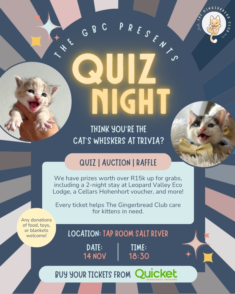 Every ticket sold directly supports The Gingerbread Club, a small volunteer-run cat rescue based in Observatory, Cape Town. Your participation helps us rescue, rehabilitate, and rehome kittens in need.