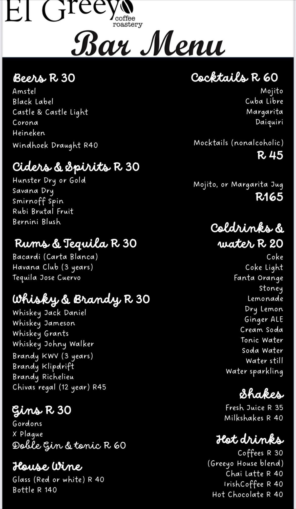 - drinks : tequila, rums, whisky, brandy, gins, beers